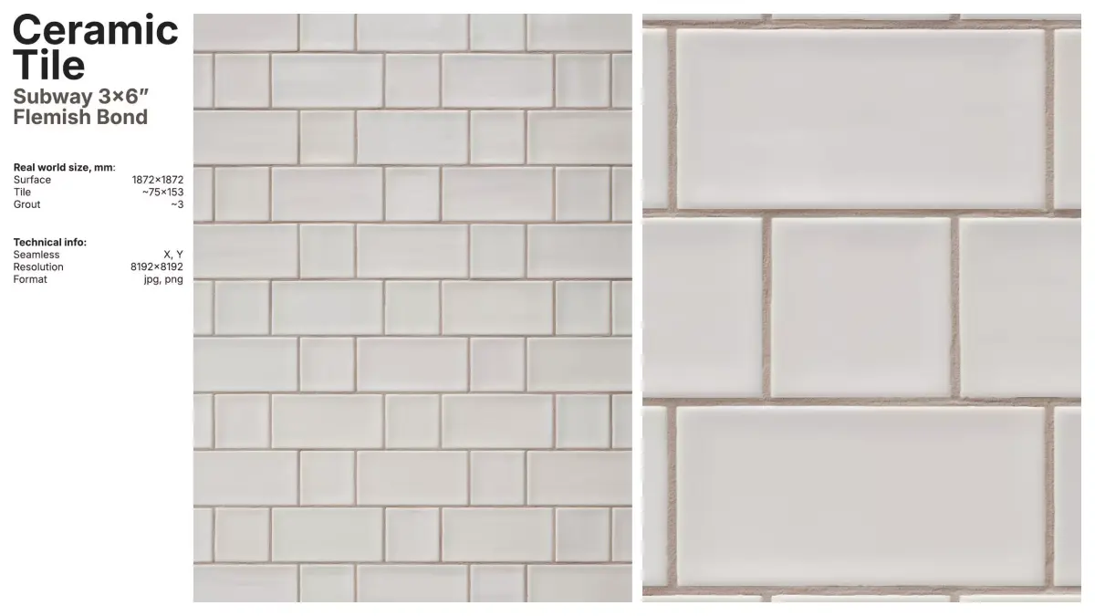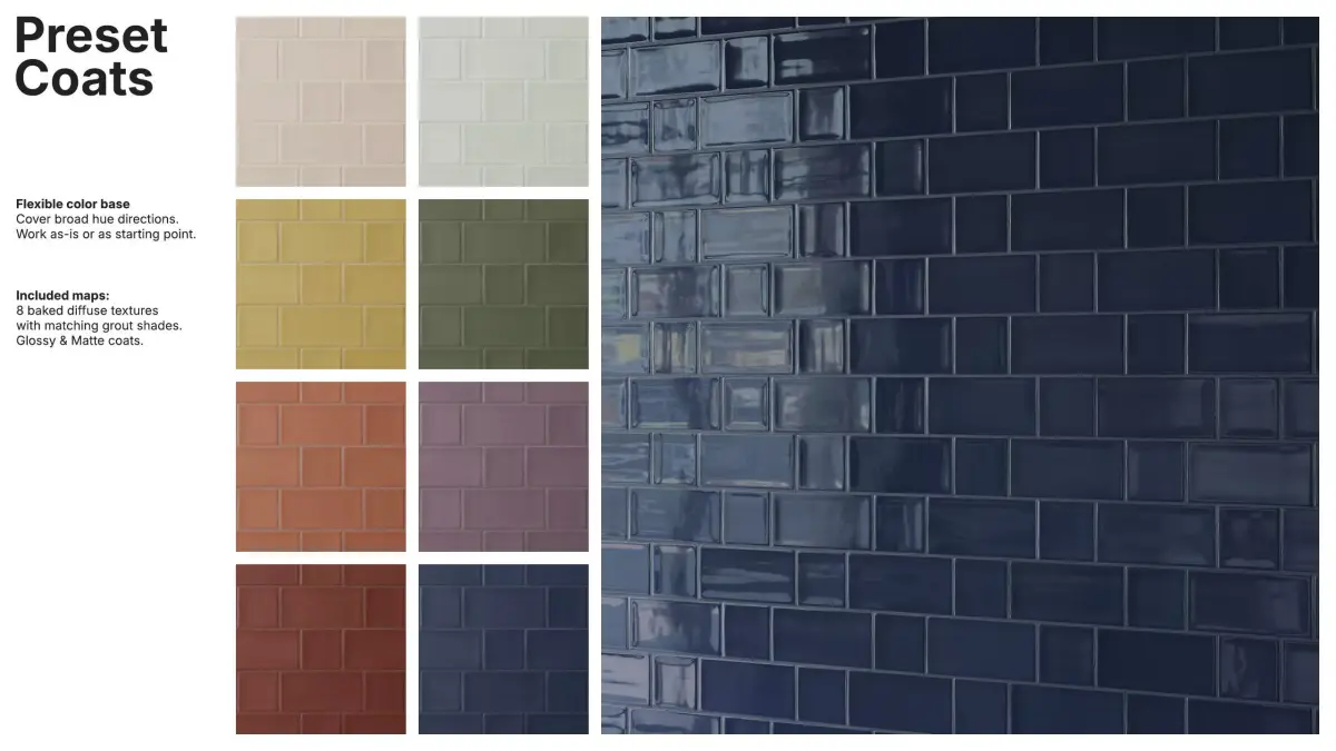 The package includes 8 diffuse variations with matching grout tones, and a flexible color base that works out-of-the-box or as a starting point for custom looks.