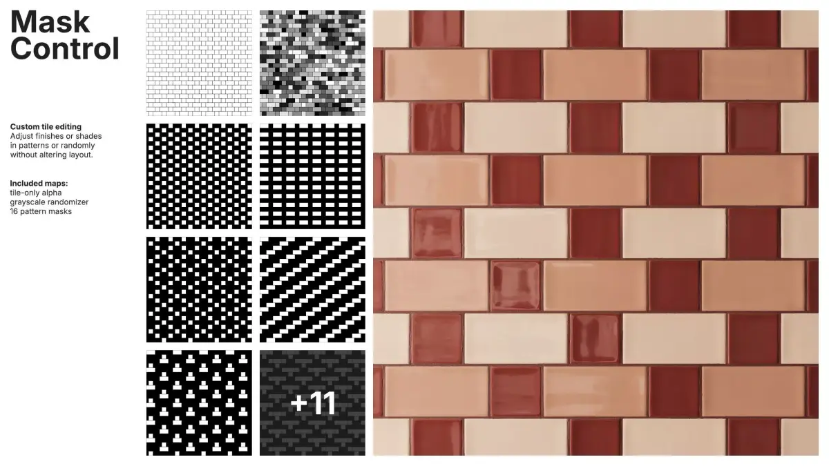 Pattern and random masks allow independent control of tile and grout colors, enabling global, per-pattern or per-tile adjustments without disturbing the layout. Tile-only alpha, a grayscale randomizer and pattern masks ensure full customization for complex designs.