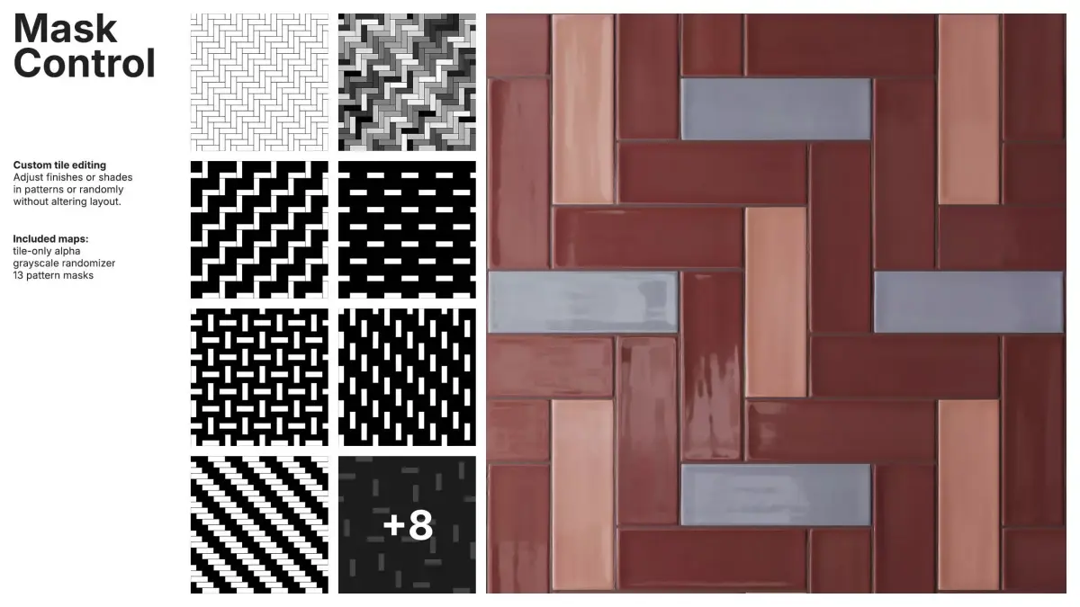 Pattern and random masks allow independent control of tile and grout colors, enabling global, per-pattern or per-tile adjustments without disturbing the layout. Tile-only alpha, a grayscale randomizer and pattern masks ensure full customization for complex designs.