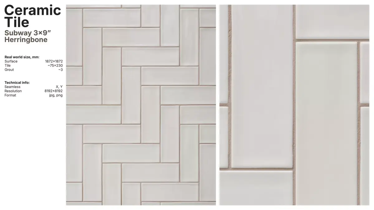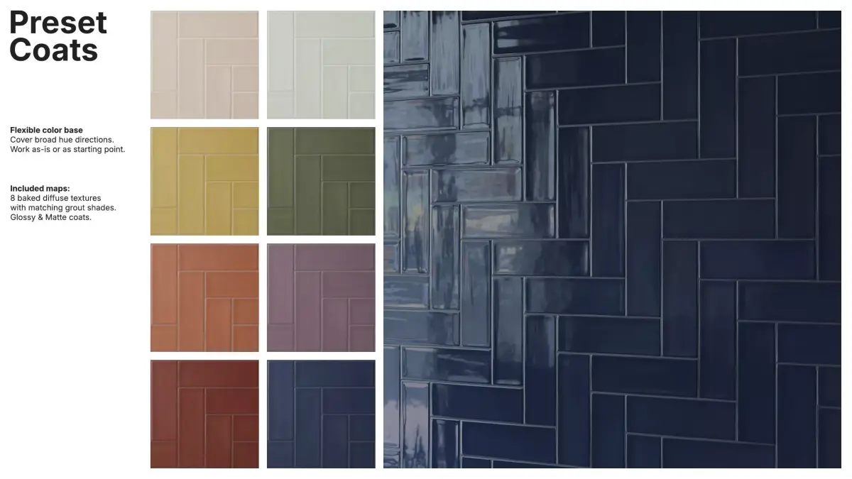 The package includes 8 diffuse variations with matching grout tones, and a flexible color base that works out-of-the-box or as a starting point for custom looks.