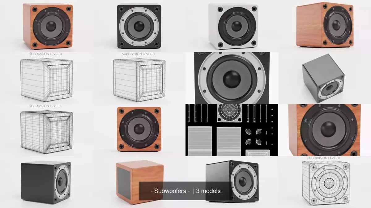 || SPECS ||-This model contains 3 separate objects.-Largest Object (Subwoofer 01) contains 3,105 polygons and 3,127 vertices with subdivision turned OFF.