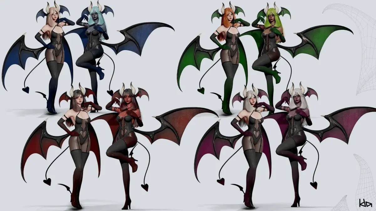 9 Texture sets - Body, Head, Clothes, Boots, Wings, Teeth, Hair, Eyes, Lashes