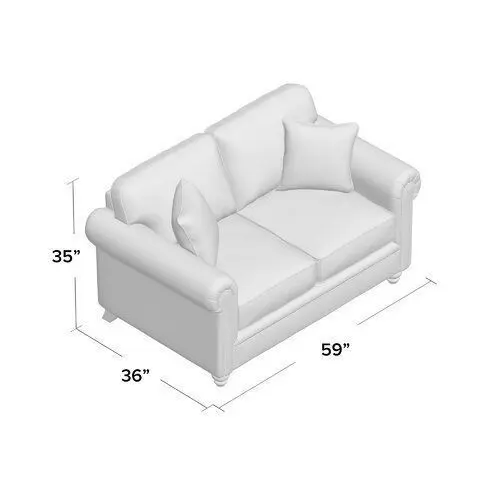 - Bring traditional style to your seating ensemble with this loveseat. Founded on a solid wood frame with corner-blocked joints, this loveseat has a full back, rolled arms, a deep seat, and turned bun feet. Enveloped in polyester-blend upholstery, this loveseat showcases piped edges and nailhead trim for a tailored touch, while foam cushioning provides comfort and support. Measuring 35H x 59 W x 36D overall, this loveseat has a 19.5 seat height and a 450 lbs. weight capacity.