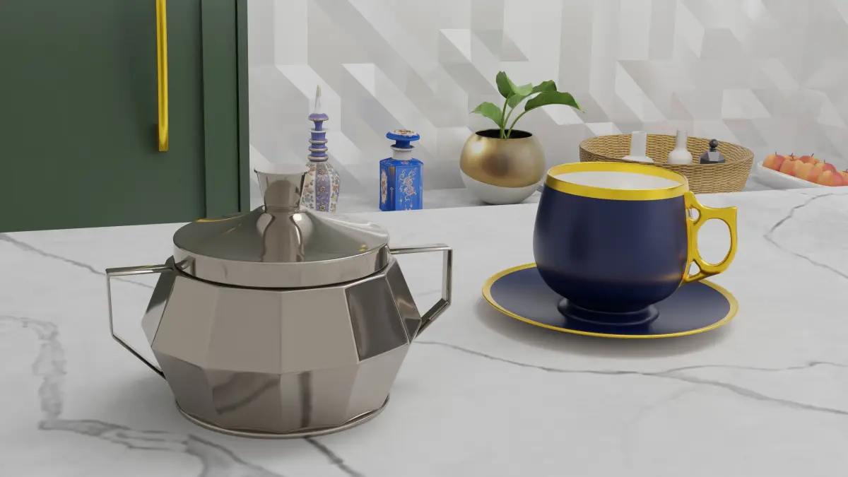Silver Plated Art Deco Sugar Bowl from 1930's, modeled after 1930's sugar bowl from Sosenko collection.Great example of modernist design. Ideal for stylish art deco kitchen either retro or modern.Unwrapped UV. Simple metallic procedural texture. Possible alternative golden color themes shown in renders (golden texture material not in .blend file)