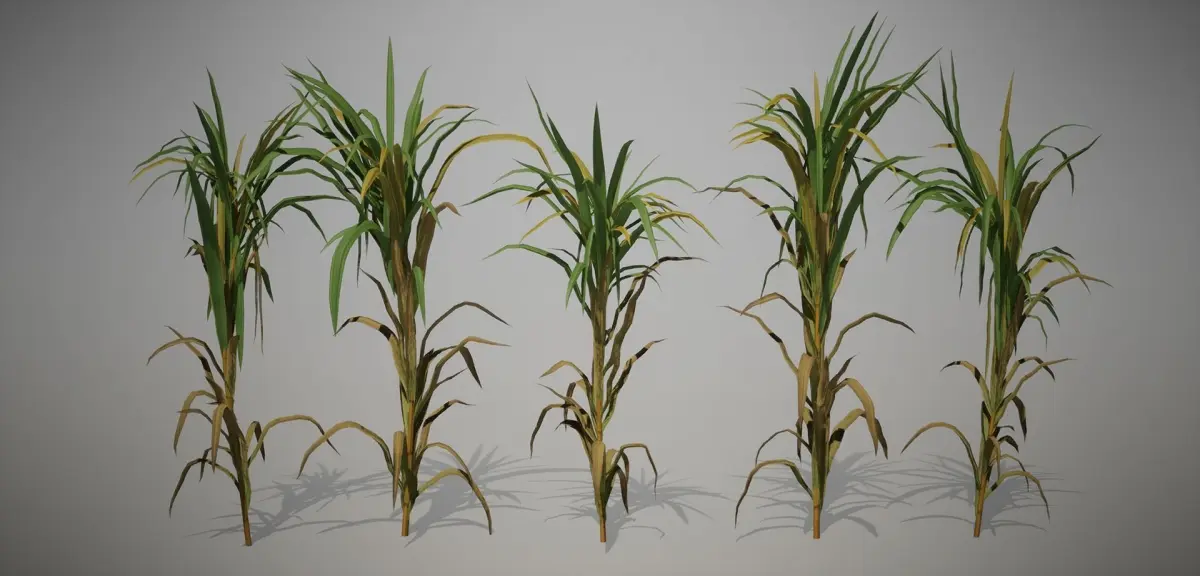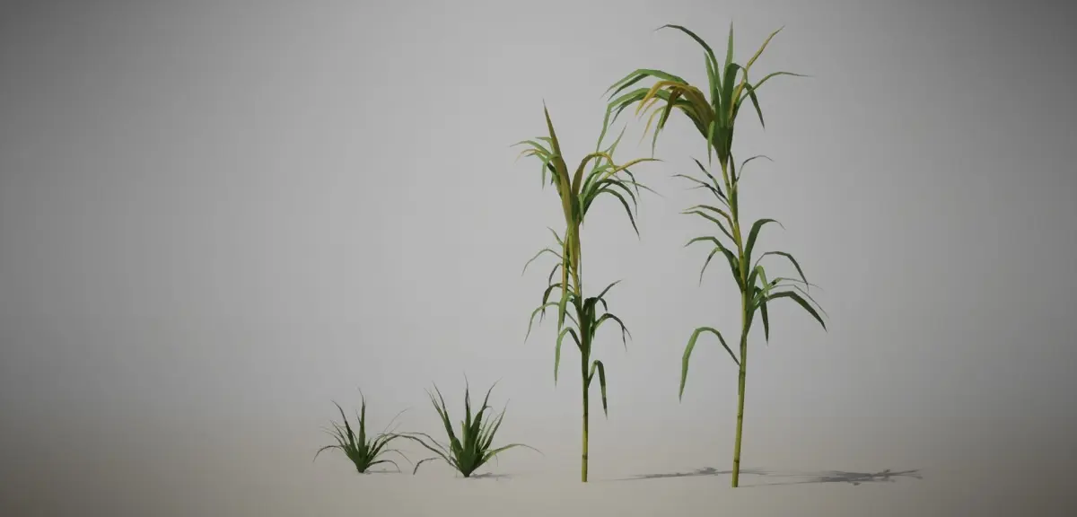 Sugar cane models made for use in a warm humid agricultural environment. Models based on various references of sugar canes large - small. There are 2 small, 2 medium and 5 large variations.