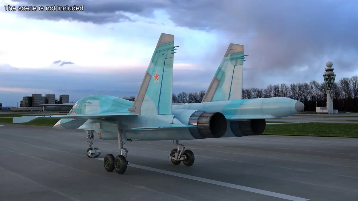 Constructed with high precision, this model features aerodynamic contours, detailed weapon systems, realistic landing gear, and a meticulously designed cockpit. The SU-34 model incorporates textured surfaces, exhaust detailing, and customizable paint schemes, making it suitable for realistic visualizations and technical presentations.
