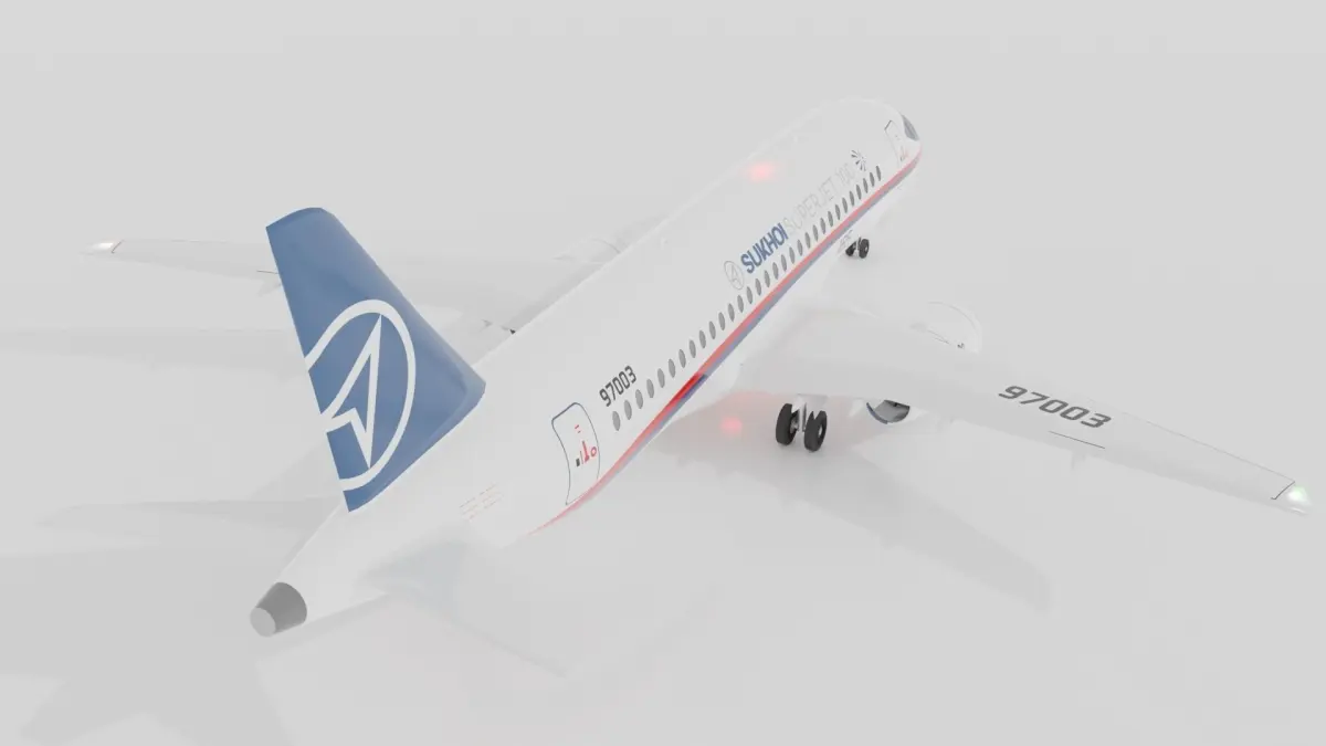 Lightweight 3D exterior model of the Russian short-range regional jet Sukhoi SSJ100 SuperJet in Sukhoi house (prototype 97003) livery. Model created with official high-quality references and blueprints. Mesh is separated into parts parented to empties for ease of use and is very clean (more than 95.7% quads). The model can be used statically as-is, or the parts can be animated. A detailed texture map makes this model perfect in games, short videos or renders.