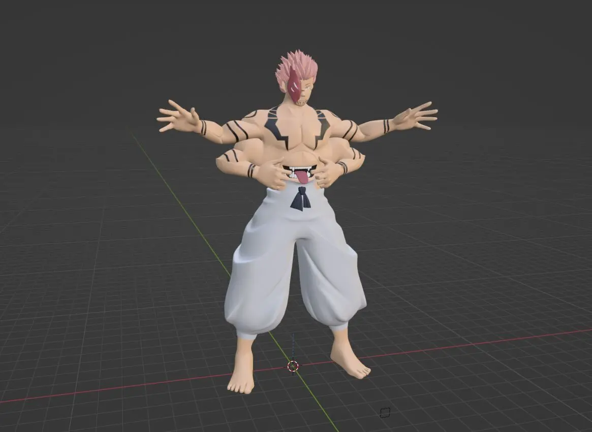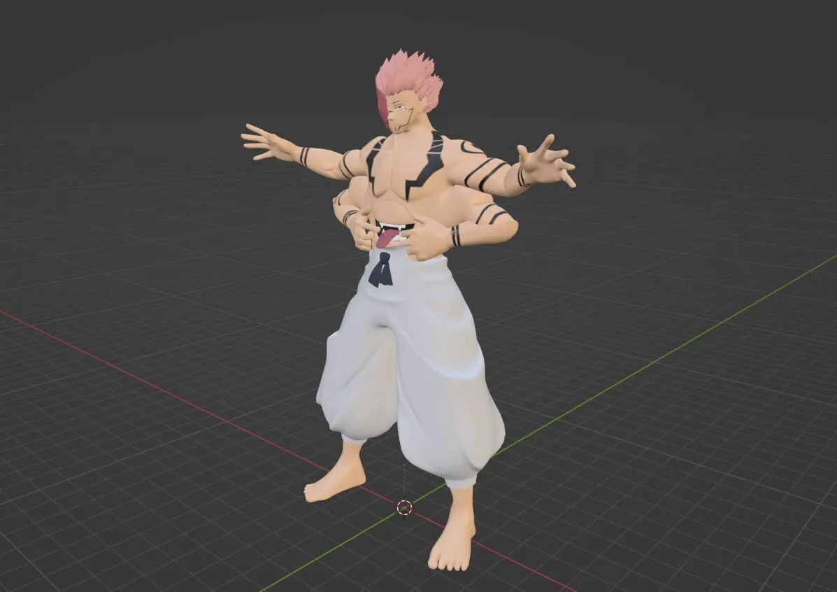 Sukuna is a tall and muscular man with four arms, four eyes, and a large mouth on his stomach. He has short pink-red hair and red eyes, with his two right eyes being angled differently and located on a white flesh plate-like structure on the right side of his face. His body is also covered in tattoos, which manifest on his vessel whenever he is in control and are naturally present in his true form. The tattoos are mostly black lines on his wrists, upper arms, upper body, abdomen, and face. Black dots are also tattooed on each his shoulders. When these tattoos manifest on a vessel with two arms, the lines encircling the upper arms and wrists are doubled, and circles form around the black dots on the shoulders. Sukuna's monstrous appearance led many to describe him as a demon with four arms and two faces. In the past and present, Sukuna only wears a pair of pants, as his unique body prevents him from wearing clothes for the upper body.