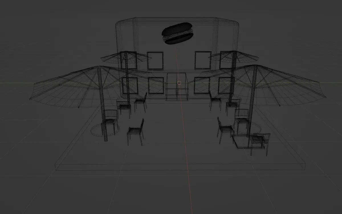 A two-story building with a burger on the roof and a summer terrace of a burger cafe with tables, chairs and umbrellas