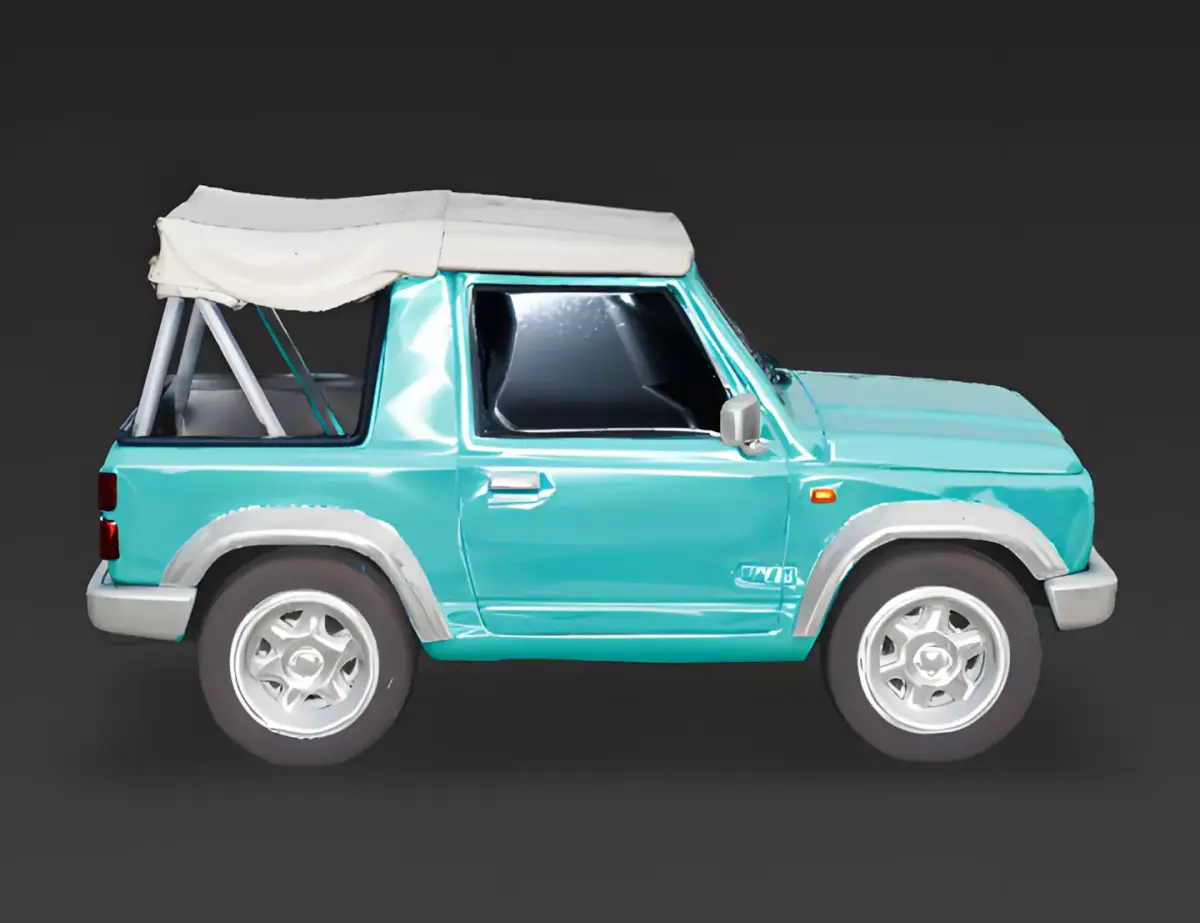 Compact Off-Road StanceThe model sits on iconic white five-spoke deep-dish rims. The tires are slightly oversized for the frame, giving the vehicle a capable yet adorable chibi-adjacent proportion without losing realistic mechanical detail.