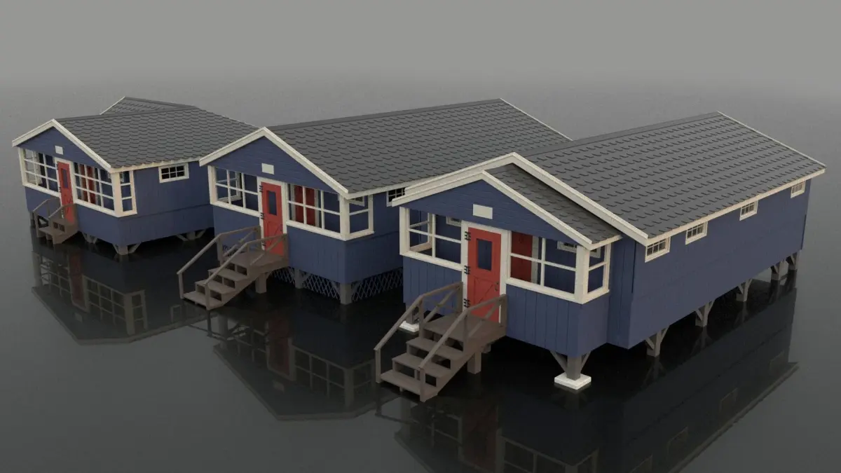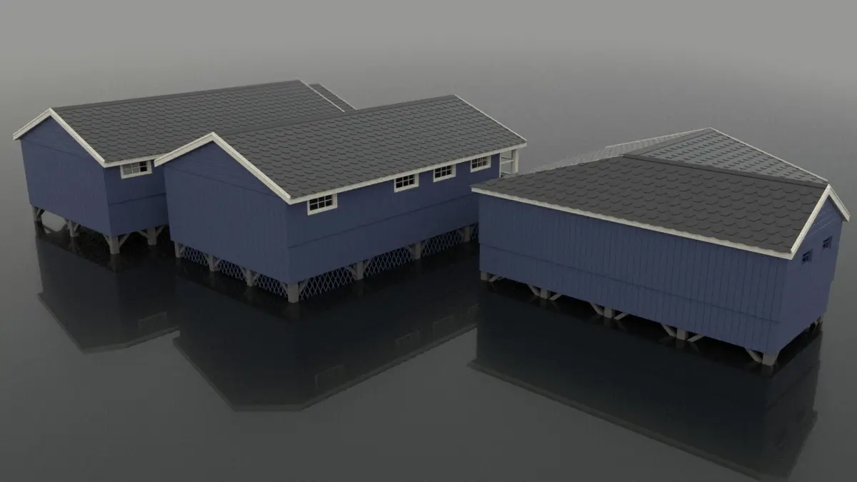 These three bunks are ready to be used in a wide range of scenes or settings. The primary purpose these cabins were built for was to bunk in a summer camp setting that would house 12 to 15 people. They have a beautiful New England wooden panel design and each cabin has its own porch. These could be used for storage of shoes or if used for another reason could house a small table and be host to some nice lakeside scenes. Other than cabins for a summer camp they could also be used as forest huts, lakeside holiday cabins or even sheds if you remove some windows. When purchased you will be buying all three of the cabins that are shown in the pictures, they are three seperate cabins to be put together to add verity to a scene