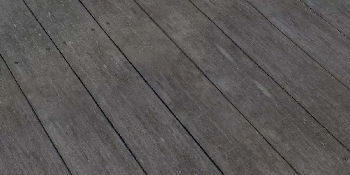 Wide grey planks with soft wear, faint saw marks, and fastener detail for authentic outdoor aging.