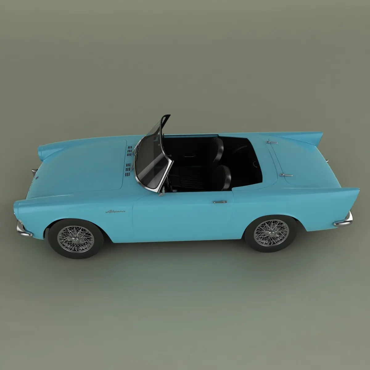 High detailed, correctly scaled model of Sunbeam Alpine Series 1 Convertible/Hardtop. Originally created with 3ds Max 8. Rendered with V-Ray, files with standard materials are included. Unit system is set to metric units. Model is built to real-world scale.