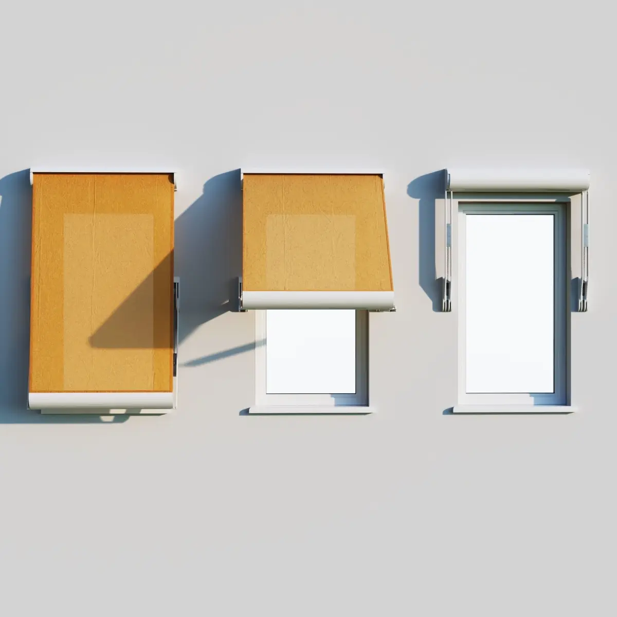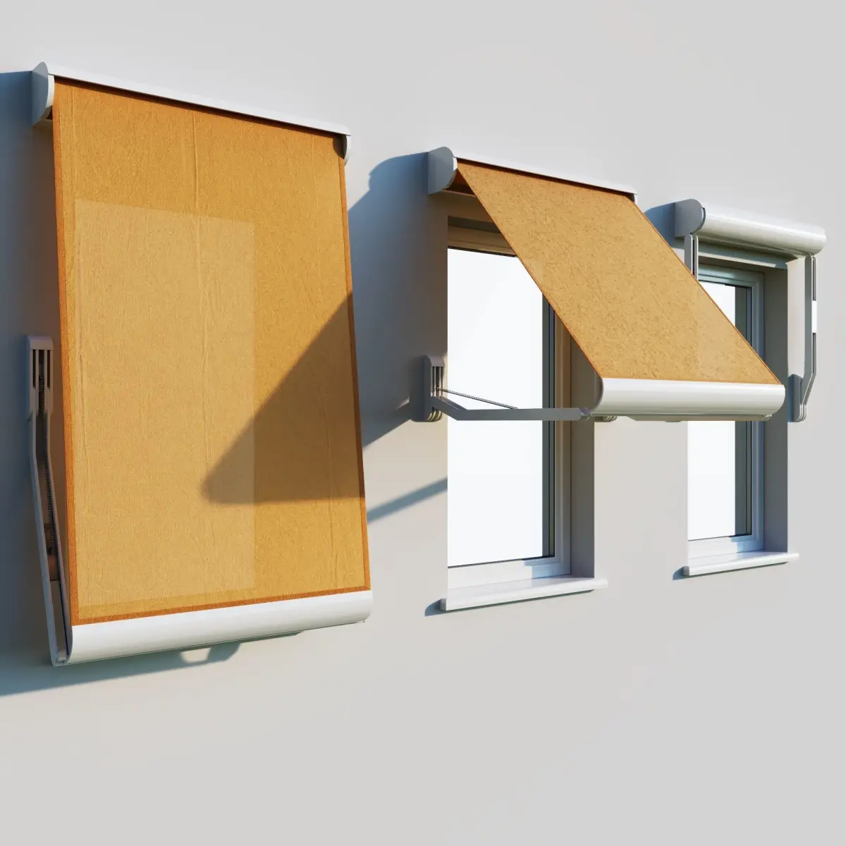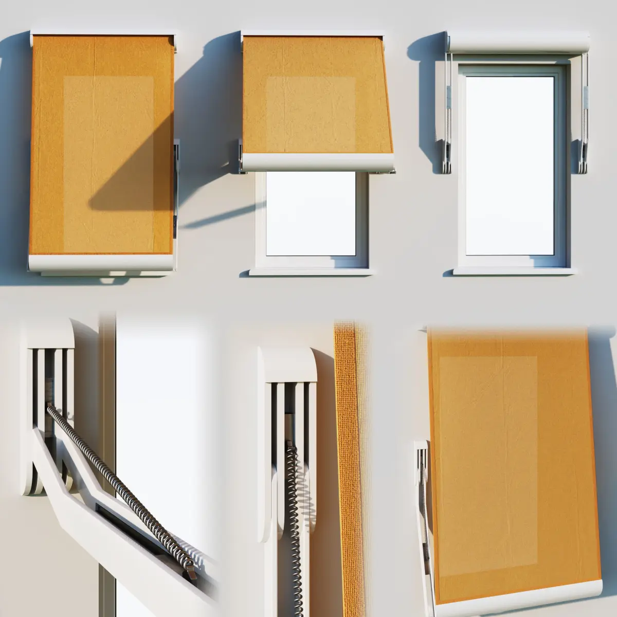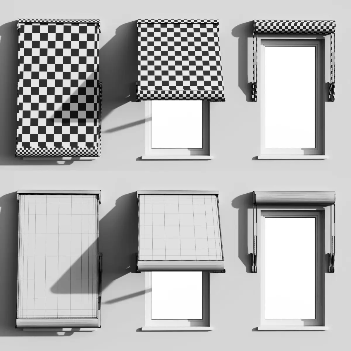 Elbow shadow canopy on the window.Three disclosure options: maximum disclosure (160 degrees for technical specifications), 90 degrees, and fully enclosed marquiseThree fabric options. Translucensy is present. On displasement - crumpled fabric textureAll marquise details with good mapping - you can change materials as you wish