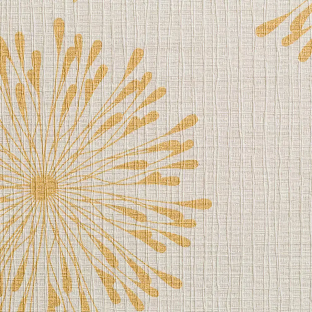 OverviewA cheerful mid‑century inspired wallpaper texture featuring repeating dandelion sunbursts in warm mustard on a creamy ground. A tactile grid‑crinkle substrate adds hand‑printed charm while keeping the palette light and versatile for living rooms, dining corners, studios, and playful retail interiors. The seamless pattern ensures clean tiling across large walls.