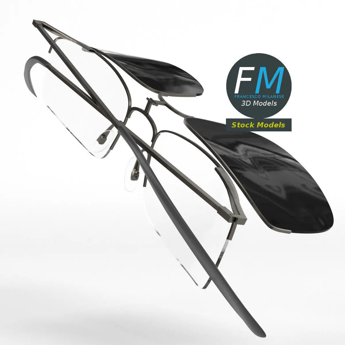 Clip-on style sunglasses 3D Model. 6 individual objects (so you can easily rotate or even animate the temples and the clip-on lenses), sharing two non overlapping UV Layout maps, Materials (lenses, other) and PBR Textures sets. Production-ready 3D Model, with PBR materials, textures, non overlapping UV Layout map provided in the package.Quads only geometries (no tris/ngons).Easily customizable: UV unwrapped geometries, so you can create new Textures (or modify the existing ones) using the UV Layout maps provided in the package (as png with alpha).Each Object, Material or Texture provided in the package has a unique, meaningful name.Made in Blender 3.2 with a Cycles PBR shader with textures included (principled and Eevee compatible), then exported to OBJ and FBX; materials and textures made in Substance Painter, exported for PBR, V-Ray, Unity, Unreal.PROMO IMAGES: the first image has been rendered in Cycles for Blender; in particular, you can find 11+ promo images in this description: