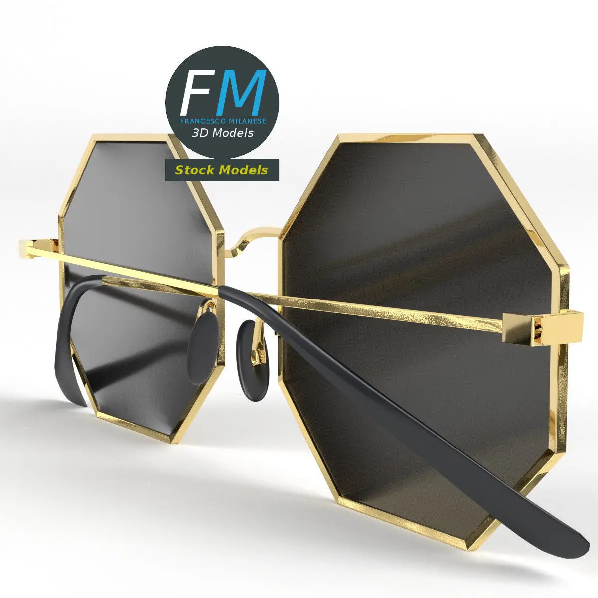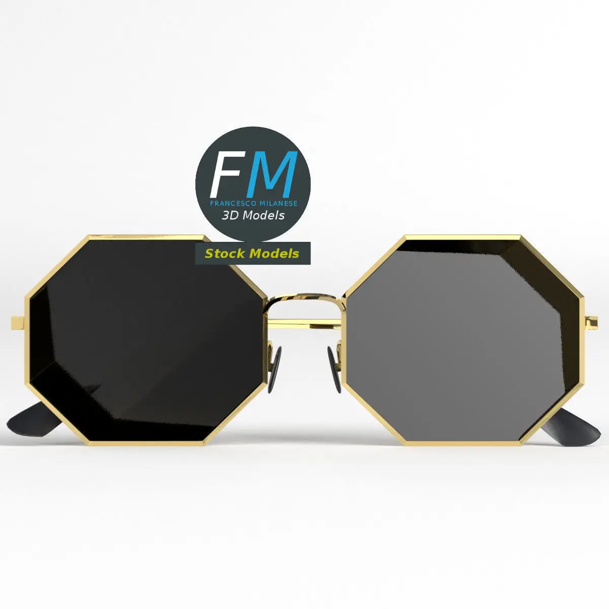 Octagonal shaped sunglasses 3D Model; mirror-like lenses (no transparency). 3 individual objects (frame, right temple, left temple; so, you can easily rotate or even animate the temples), sharing the same non overlapping UV Layout map, Material and PBR Textures set. Production-ready 3D Model, with PBR materials, textures, non overlapping UV Layout map provided in the package.Quads only geometries (no tris/ngons).Easily customizable: UV unwrapped geometries, so you can create new Textures (or modify the existing ones) using the UV Layout maps provided in the package (as png with alpha).Each Object, Material or Texture provided in the package has a unique, meaningful name.Made in Blender 3.2 with a Cycles PBR shader with textures included (principled and Eevee compatible), then exported to OBJ and FBX; materials and textures made in Substance Painter, exported for PBR, V-Ray, Unity, Unreal.PROMO IMAGES: the first image has been rendered in Cycles for Blender; in particular, you can find 11+ promo images in this description: