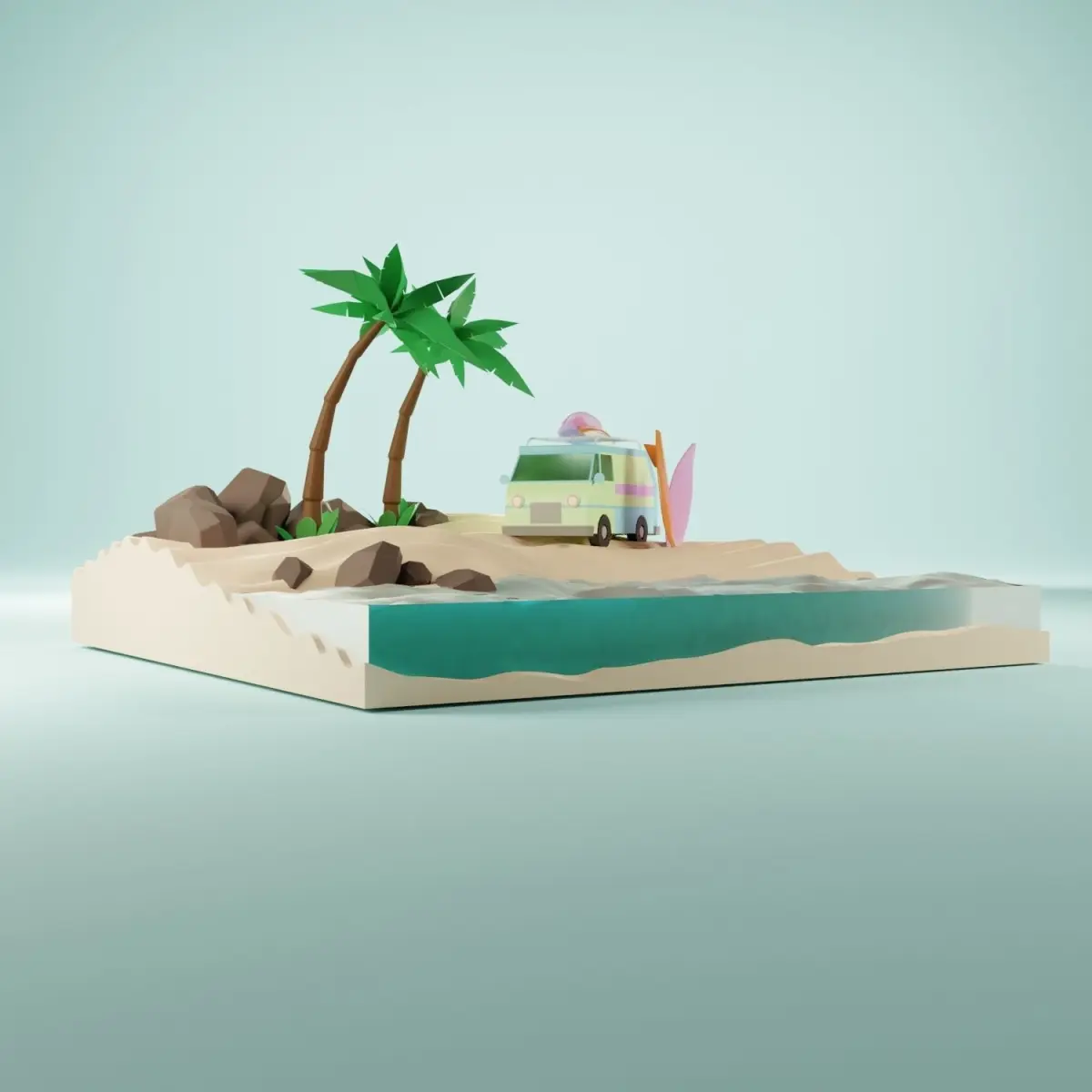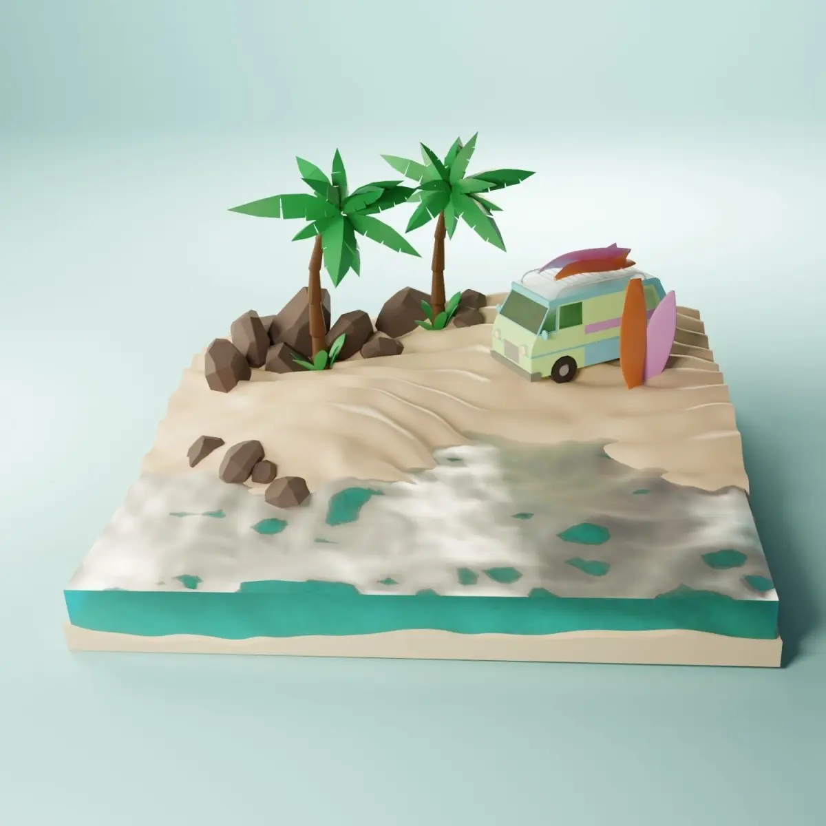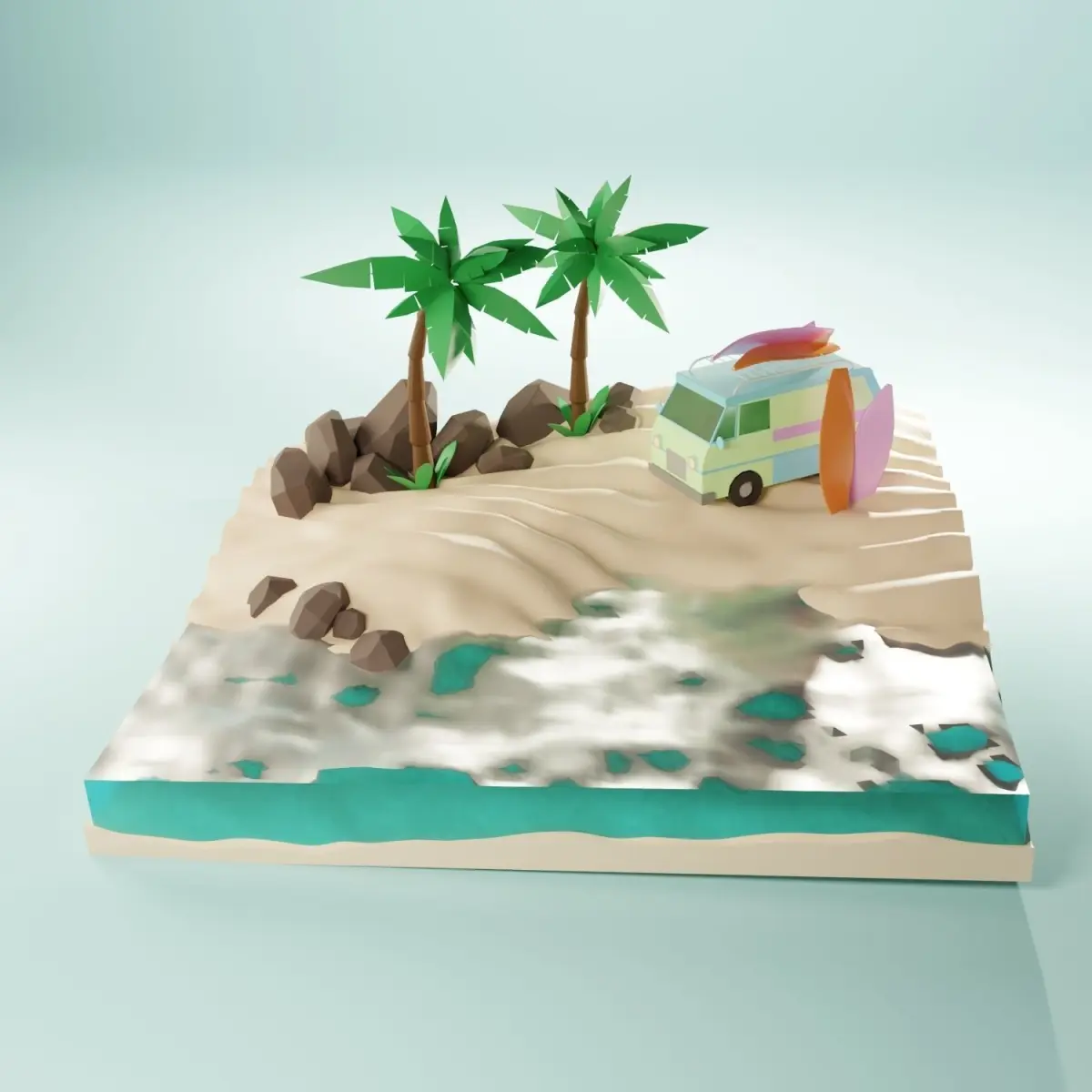 Sunny tropical beach with van and surf,low-poly 3D model,Blender rendering