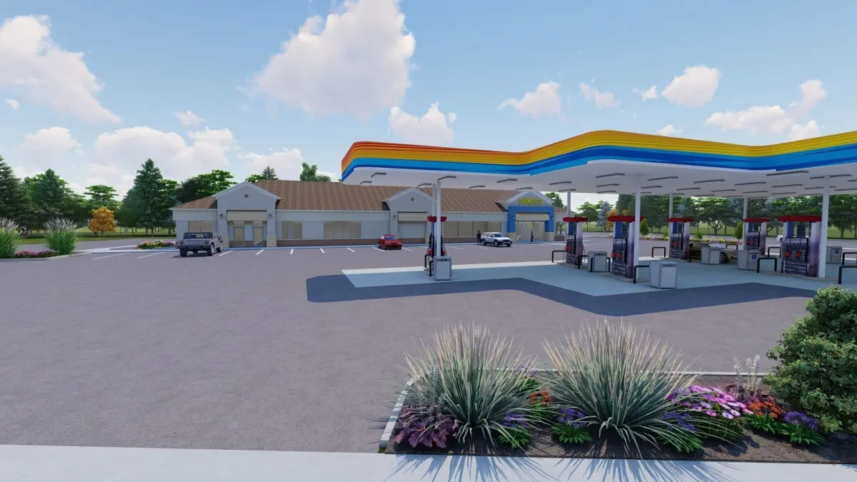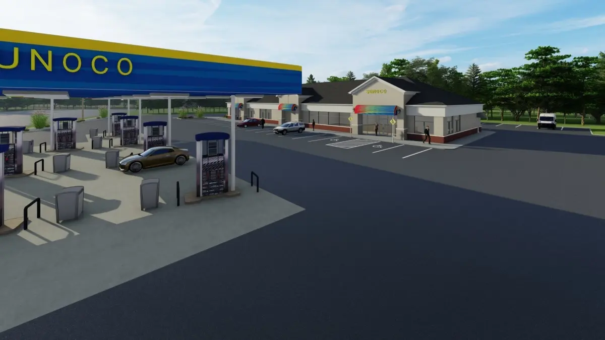 Sunoco Gas Station with pumps and canopy, street view for city project. If you should need something removed or changed after purchase please contact us.