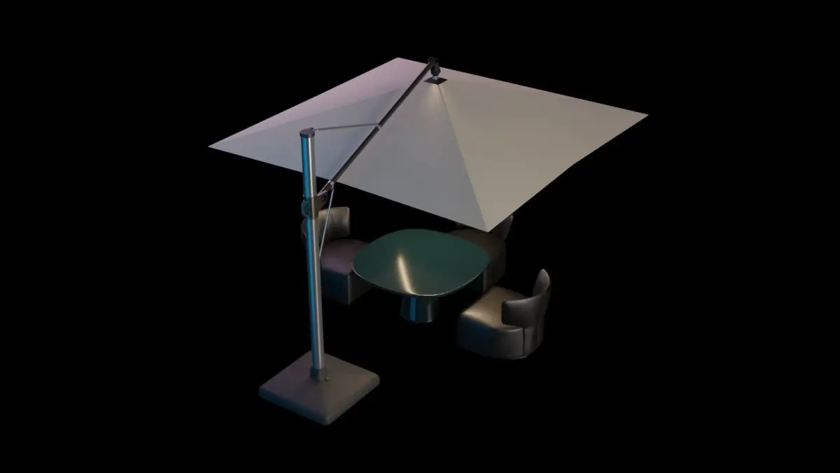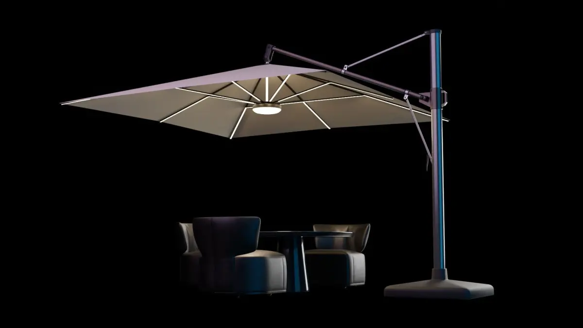 Sunshade umbrella and sofa end table, you can sit in the sun and drink tea. There is a light above the inner bracket of the parasol. Umbrellas don't fold.