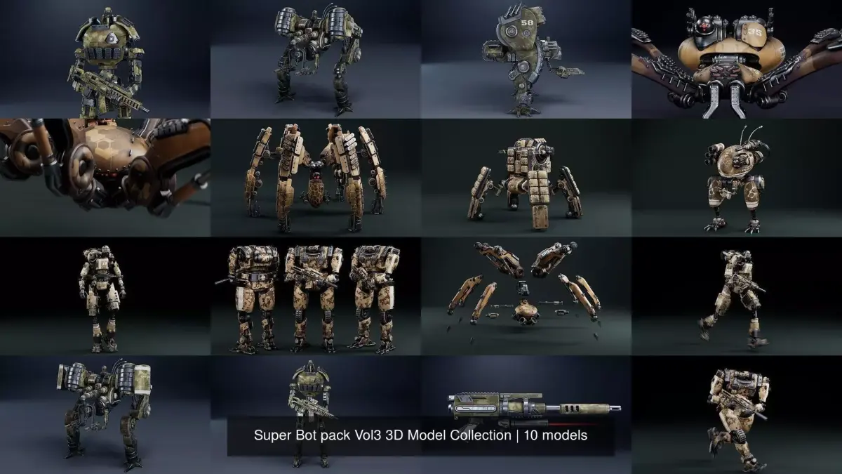 This pack is assembled from 10 models from the collection of Super Bot pack Vol.3. For more information, video, description, you can look at each asset separately, or in the auto assembly in this product. All models have a lot of animations, pbr of the texture, all go both in the unit and in the unreal game engines.