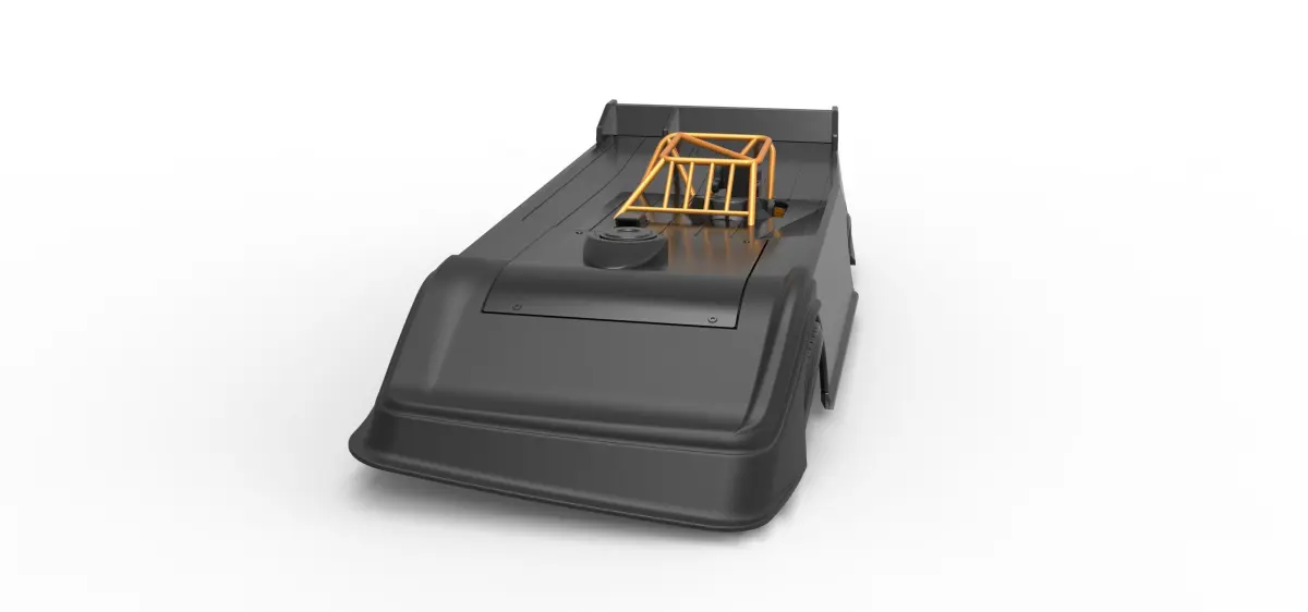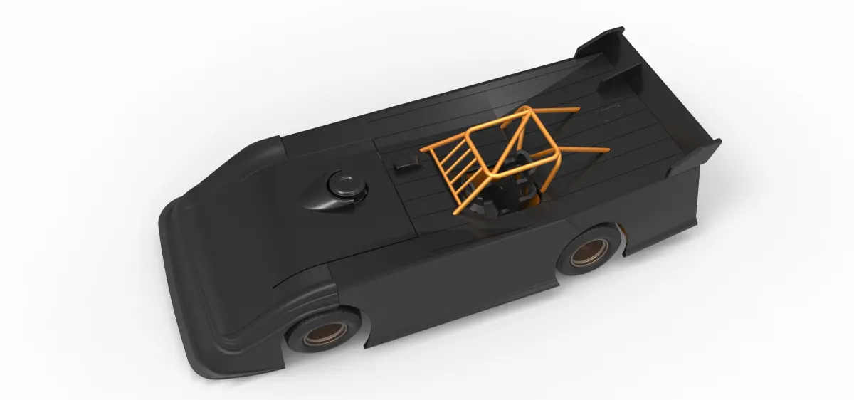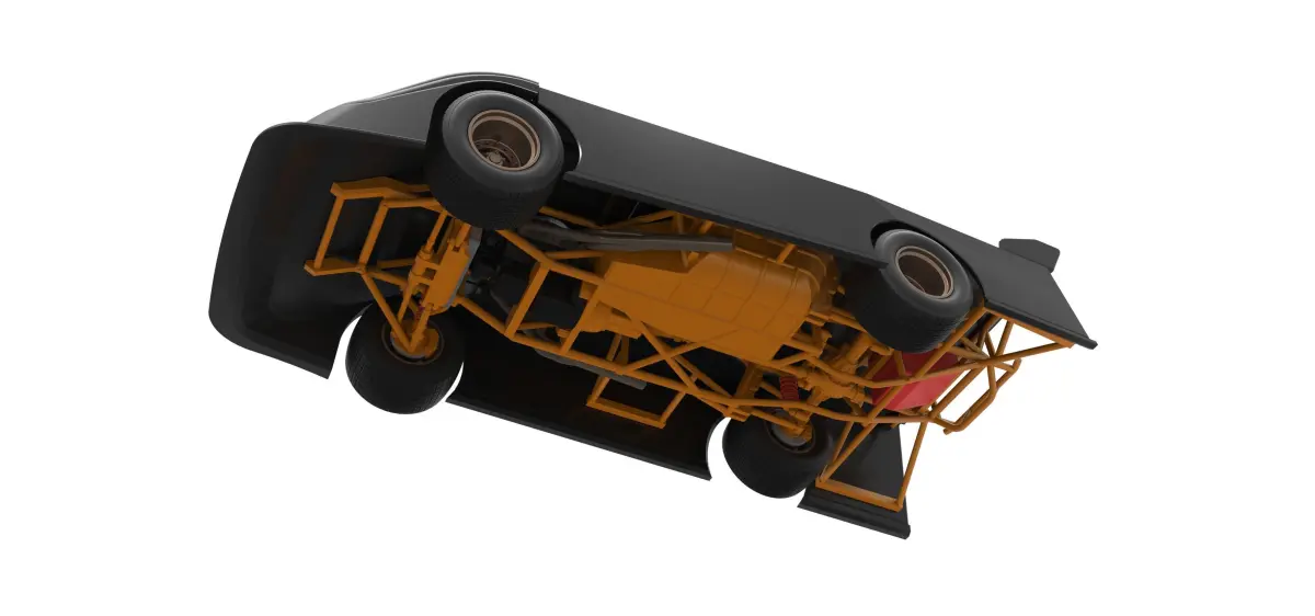 The model consists of parts: Air filter cap, Air filter, Body, Engine, Hood, Left exhaust pipe, Radiator, Rear spoiler, Right exhaust pipe, Rim covers, Rims, Roll cage, Seat part 1,2, Shell part 1,2, Shifter, Steering wheel, Tank, Tires.