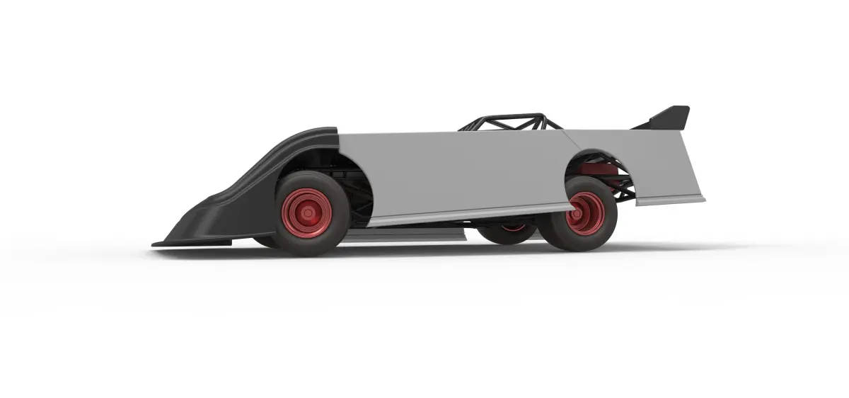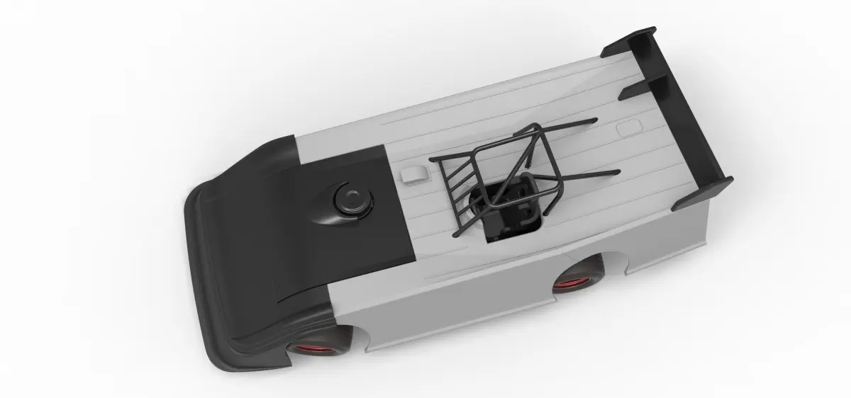 The model consists of parts: Air filter cap, Air filter, Body, Engine, Front right tire, Hood, Left exhaust pipe, Radiator, Rear spoiler, Right exhaust pipe, Rim covers, Rims, Roll cage, Seat part 1,2, Shell part 1,2, Shifter, Steering wheel, Tank, Tires.