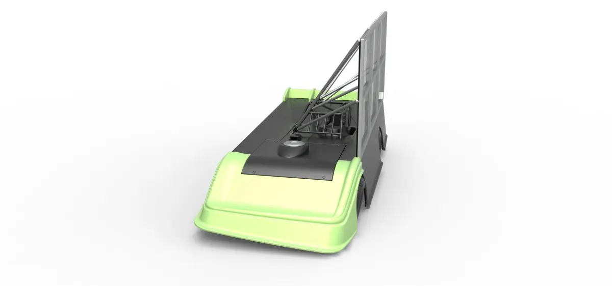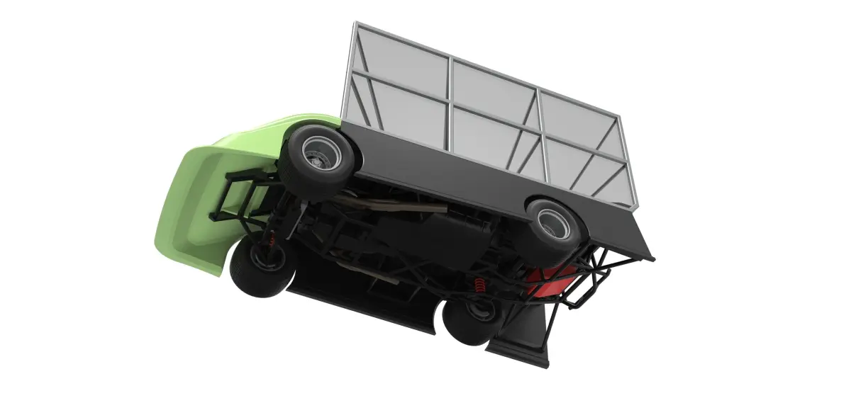 The model consists of parts: Air filter cap, Air filter, Body, Engine, Hood, Left exhaust pipe, Radiator, Rear spoiler, Right exhaust pipe, Rim covers, Rims, Seat part 1,2, Shell part 1,2, Shifter, Steering wheel, Tank, Tires, Top bar, Wing bar 1-8, Wing frame, Wing plate.