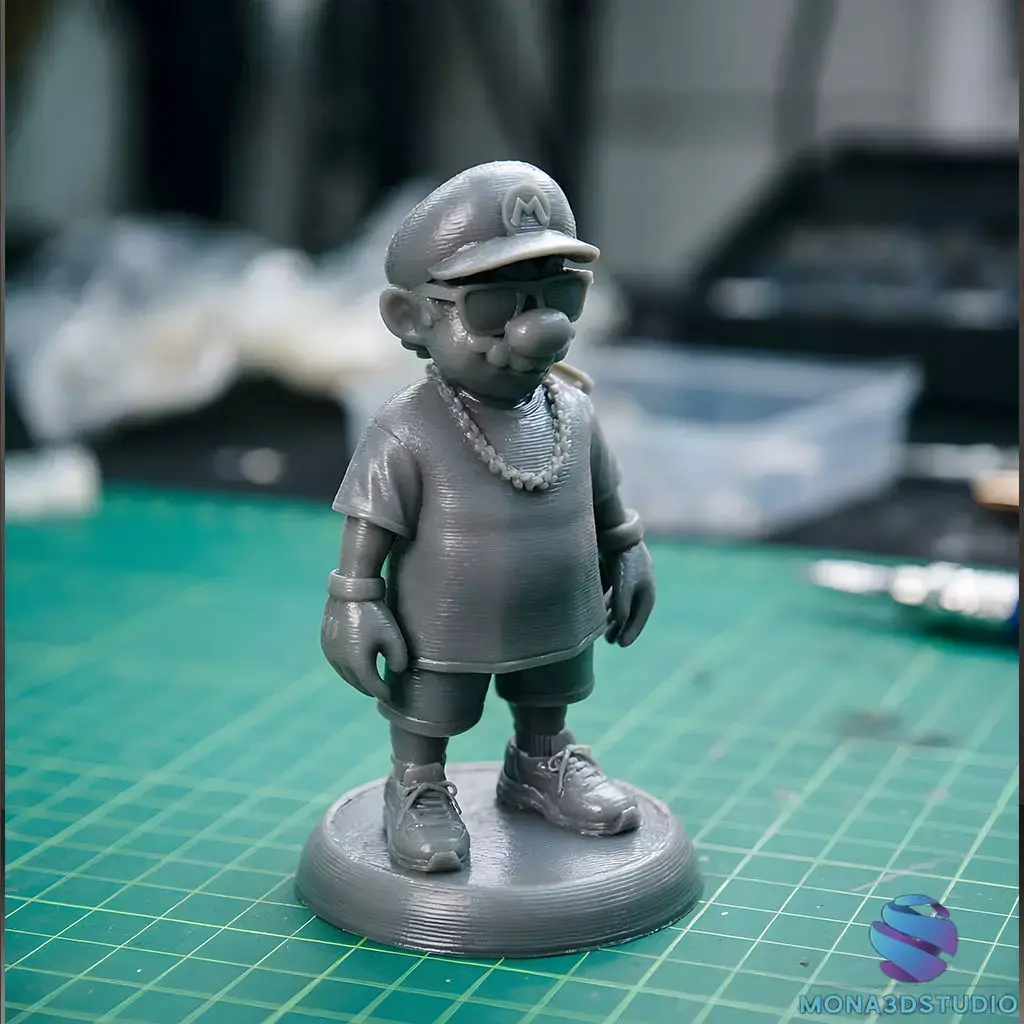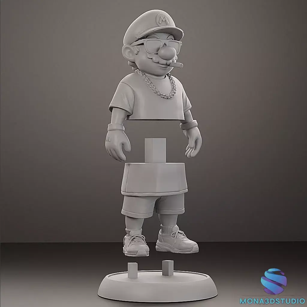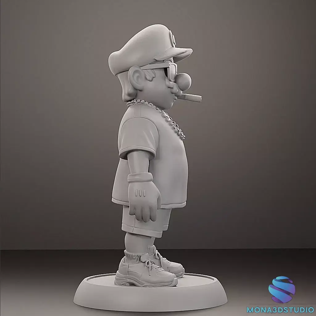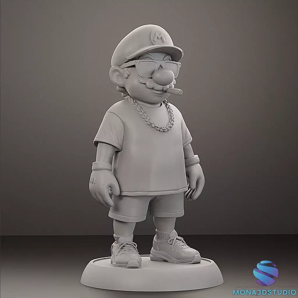 Description: Add some urban attitude to your collection with this exclusive Street Style version of Super Mario. This high-quality 3D model features Mario in a modern outfit complete with a t-shirt, gold chain, sunglasses, and a cigar.