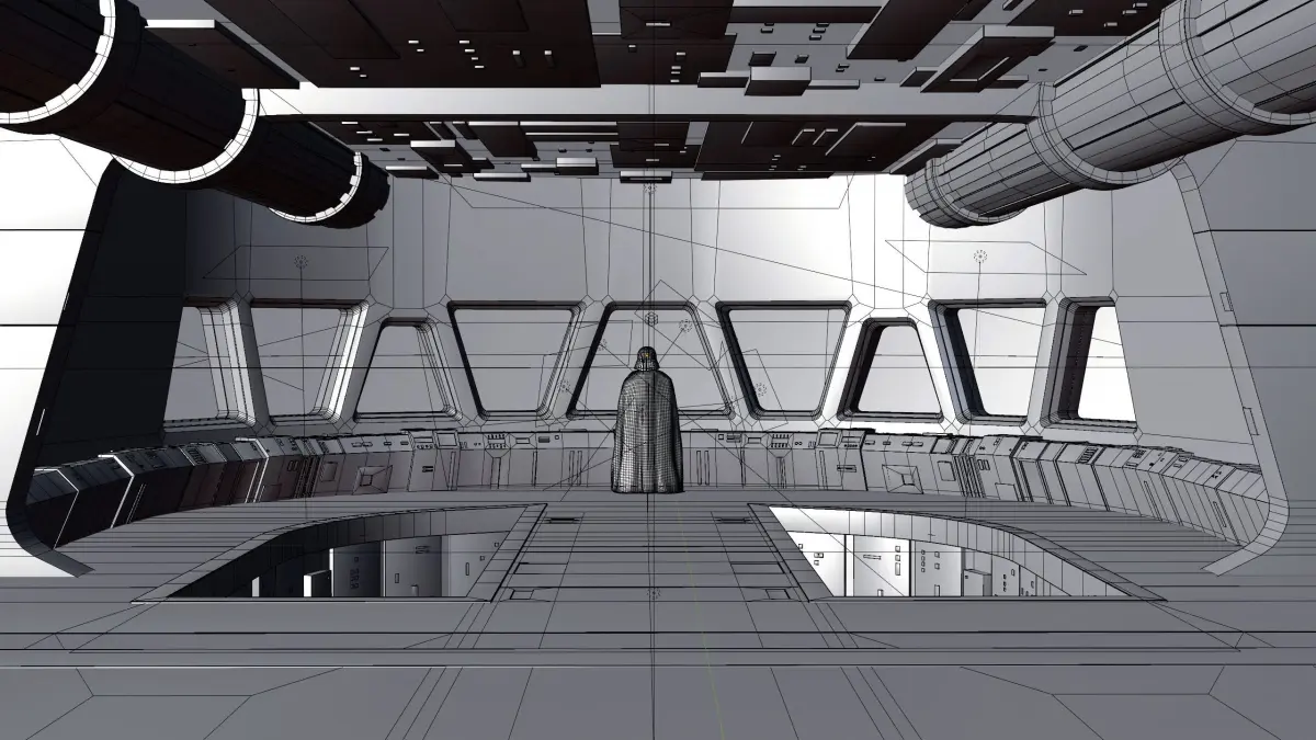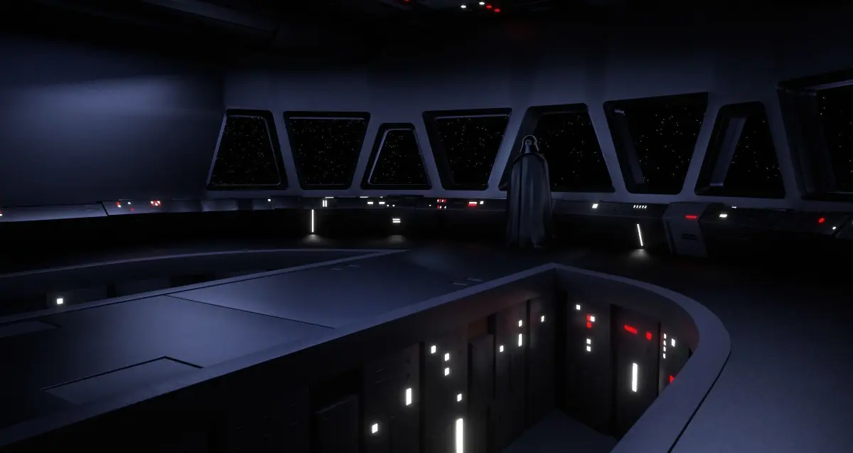Super Star Destroyer Bridge 3d environment. Darth Vader is looking out of the Star Destroyer windows. This scene was created in Blender Eevee, but also looks great in Cycles.