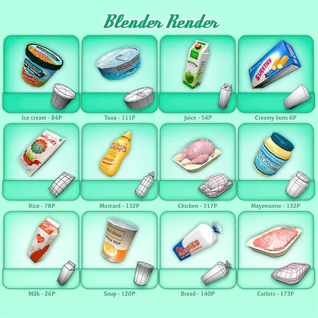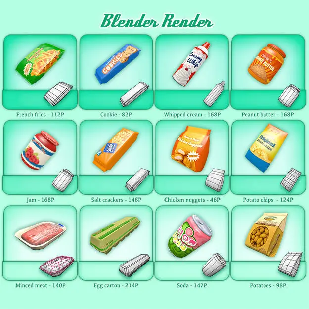 Items (Polygons): - Beans (120P)- Beer can (147P)- Bread (140P)- Bubblegum (6P)- Butter (6P)- Candy bar (38P)- Cereal (6P)- Cheese (108P)- Chicken (317P)- Chicken nuggets (46P)- Chocolate syrup (204P)- Coffee (96P)- Cookies (82P)- Creamy Buns (6P)- Creme fraiche (84P)- Cutlets (173P)- Egg carton (214P)- Fish sticks (6P)- Flour (88P)- French fries (112P)- Ice cream (84P)- Jam (168P)- Juice (54P)- Ketchup (132P)- Lollipop (79P)- Luncheon meat (169P)- Macaroni & cheese (54P)- Mayonnaise (132P)- Milk (26P)- Minced meat (140P)- Mustard (132P)- Noodles (64P)- Pasta (98P)- Peanut butter (168P)- Plastic box (135P)- Potato chips (124P)- Potatoes (98P)- Pudding (92P)- Rice (78P)- Salami (120P)- Salmon (140P)- Salt (6P)- Salt crackers (146P)- Six pack (936P)- Soda (147P)- Soda bottle (193P)- Soup (120P)- Sugar (88P)- Sushi chutoro (44P)- Sushi ebi (74P)- Sushi nigiri (50P)- Sushi piece (24P)- Sushi tamagoyaki (82P)- Tuna (111P)- Whipped cream (168P)*All the models have been created with Blender and exported to different formats via Blender. You might have to manually assign textures and some formats might have other technical issues. This is reflected in the price.