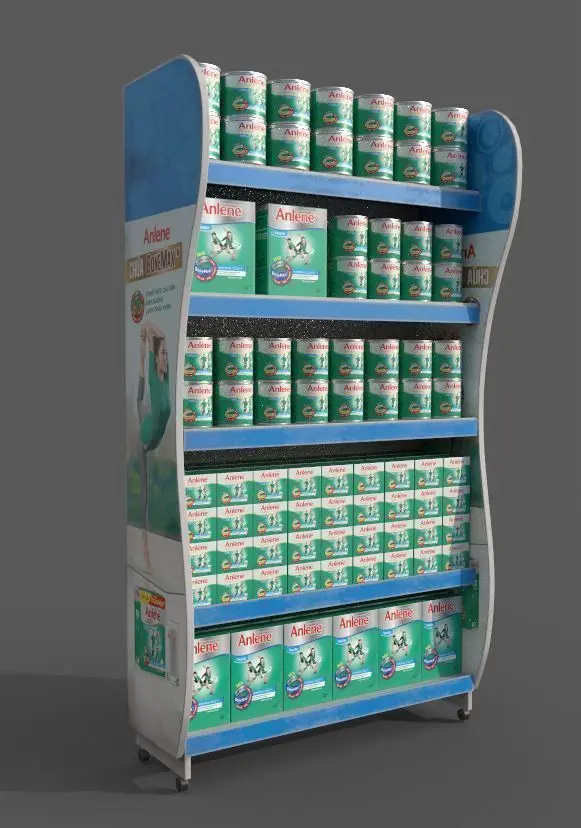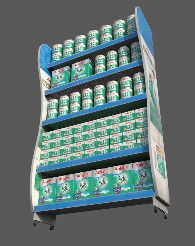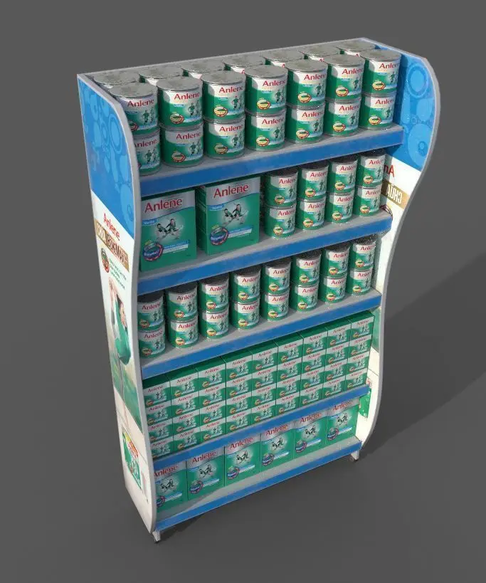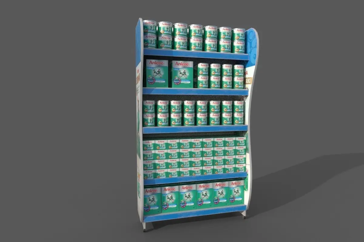 Supermarket shelves for milk cans with realistic look, poly, texture, and details are optimized as natural scale. Details, clean and tidy model.