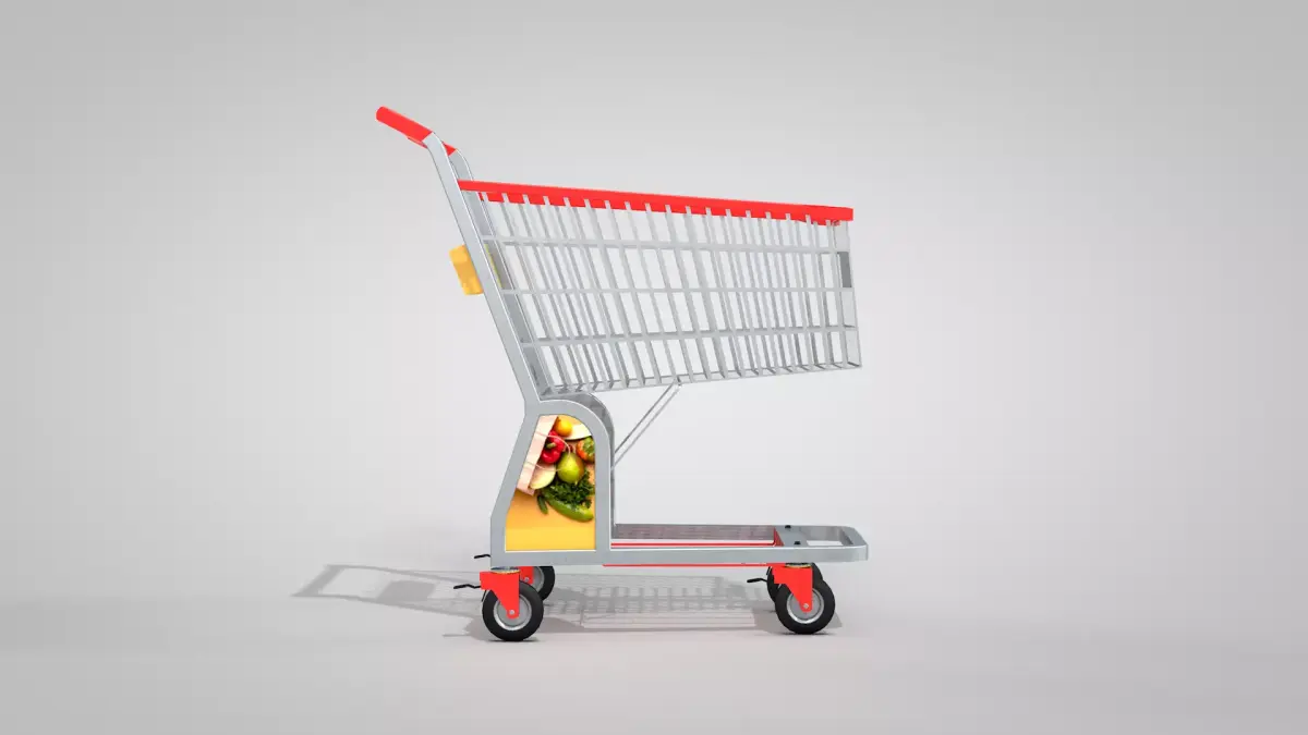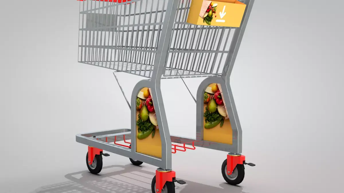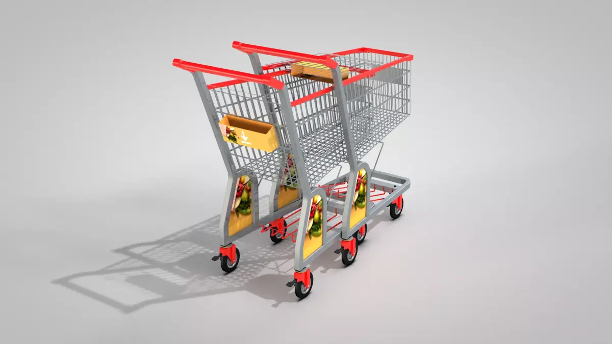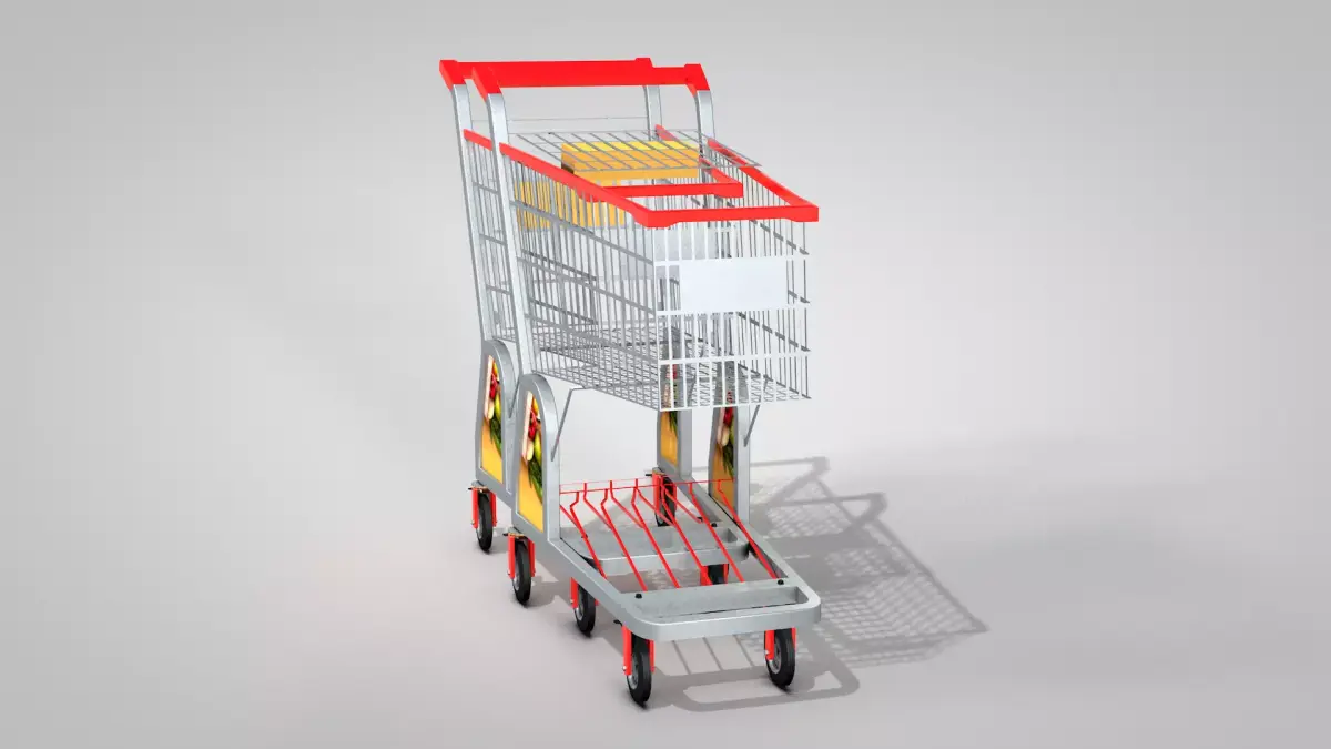 Supermarket Trolley with 1 Basket 3D created in Cinema 4D and exported to other formats: fbx, obj, dae, obj, blend, glb and c4d. The texture is basic and you can define the color of the supermarket trolley with 1 basket. It has a front panel, sides and a personal items box where a logo can be applied. The psd file is in the tex folder.