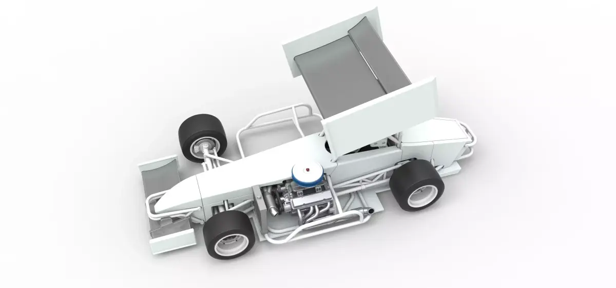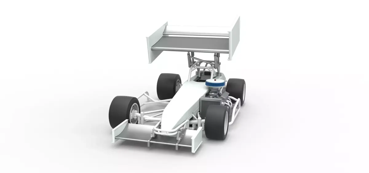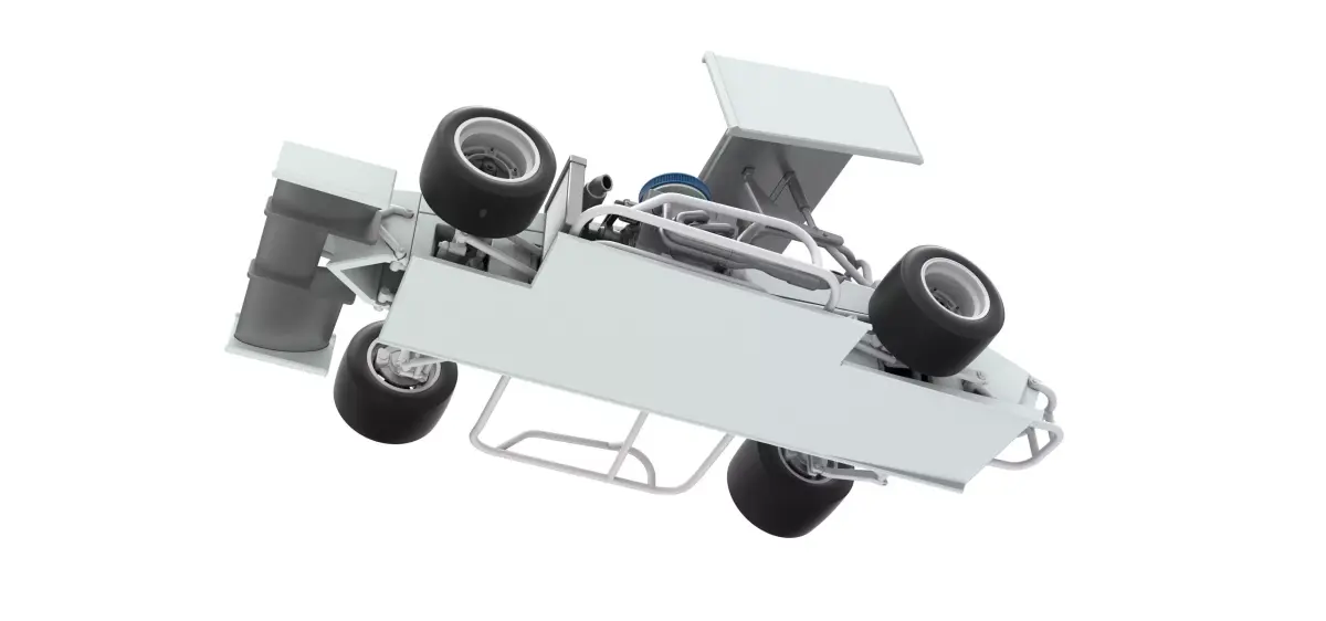 The model consists of parts: Air filter part 1-3, Bottom plate, Engine, Frame, Front bumper, Front left rim, Front left tire, Front right rim, Front right tire, Front wing central part, Front wing left part, Front wing right part, Hood, Left exhaust, Nose, Radiator, Rear bumper, Rear left rim, Rear left tire, Rear right rim, Rear right tire, Rear wing central part, Rear wing left part, Rear wing left stand, Rear wing right part, Rear wing right stand, Right exhaust part 1,2, Seat, Shell left part 1-5, Shell rear part, Shell right part 1-5, Shifter, Spacer, Steering wheel, Tail with slots for Rear wing, Tail, Tank, Top wing central part, Top wing left part, Top wing mount, Top wing rear part, Top wing right part.