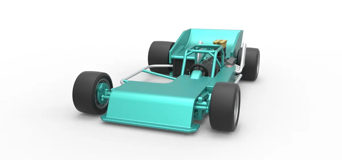 The model consists of parts: Air intake, Body, Engine, Front left rim, Front left tire, Front right rim, Front right tire, Left exhaust pipes, Radiator, Rear insert, Rear left rim, Rear left tire, Rear right rim, Rear right tire, Right exhaust pipes, Seat, Shell part 1,2, Shifter, Steering wheel.