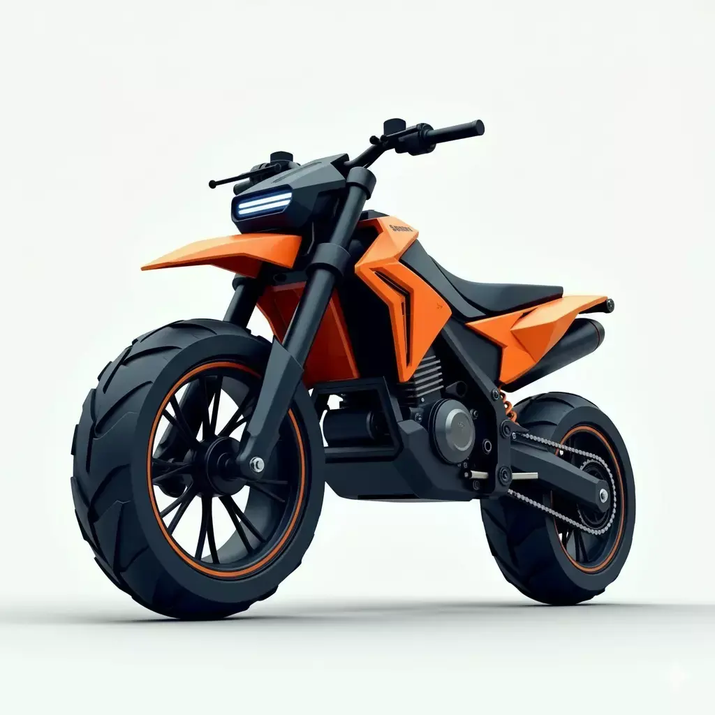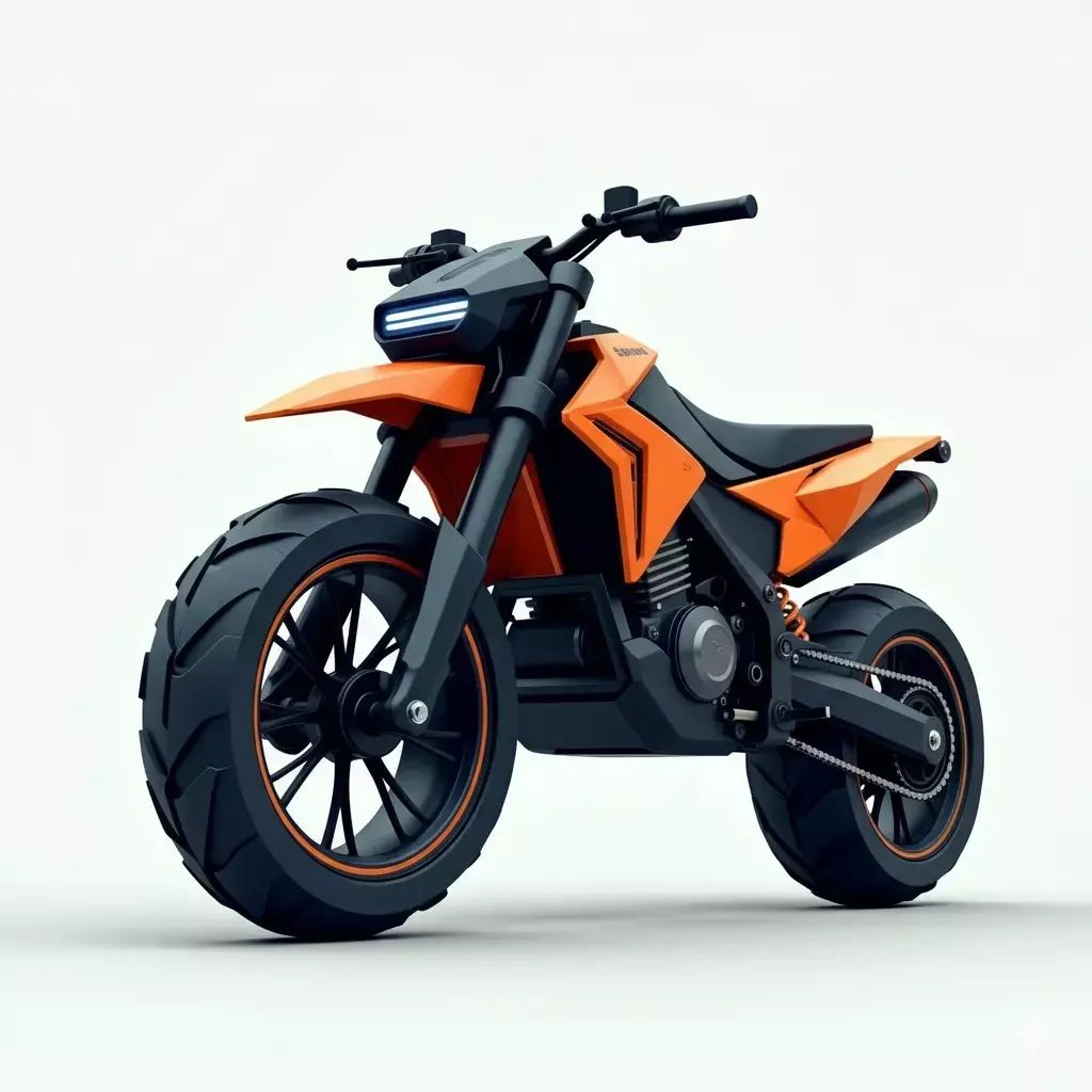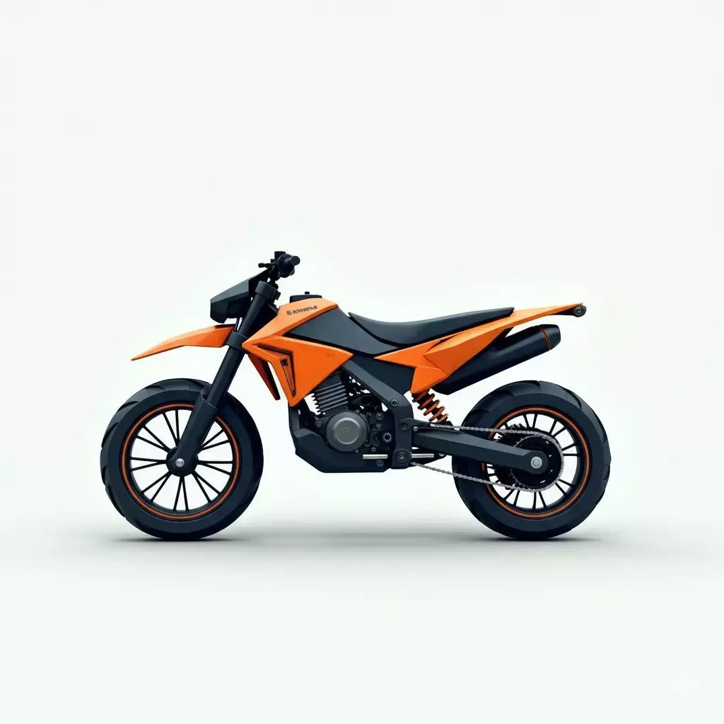 The color scheme features a striking combination of vibrant orange fairings and a dark, matte black chassis and engine components. The design is characterized by its chunky, stylized tires, long-travel suspension, and angular body panels that give it a contemporary, almost futuristic look. The front end is simple yet sharp, with a distinct horizontal LED headlight element. This digital asset is well-suited for use in stylized video games, animations, or visualizations that require a unique, high-energy sport motorcycle with a focus on powerful aesthetics.
