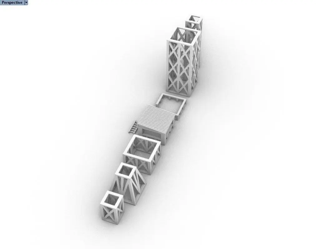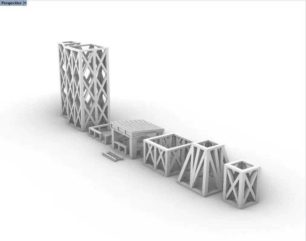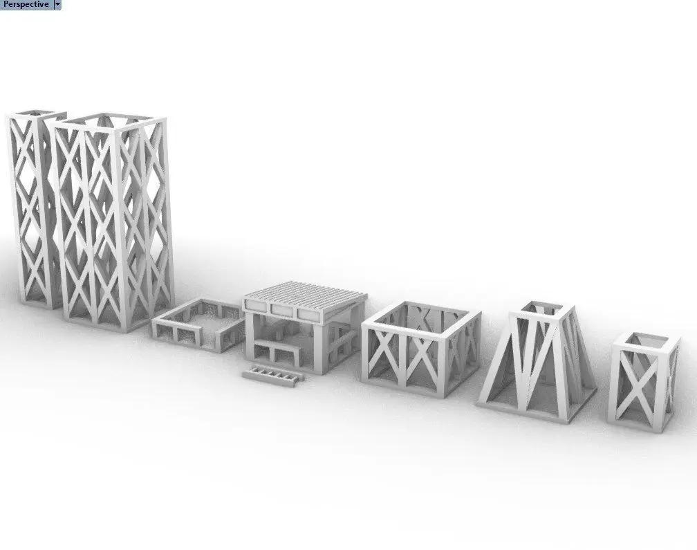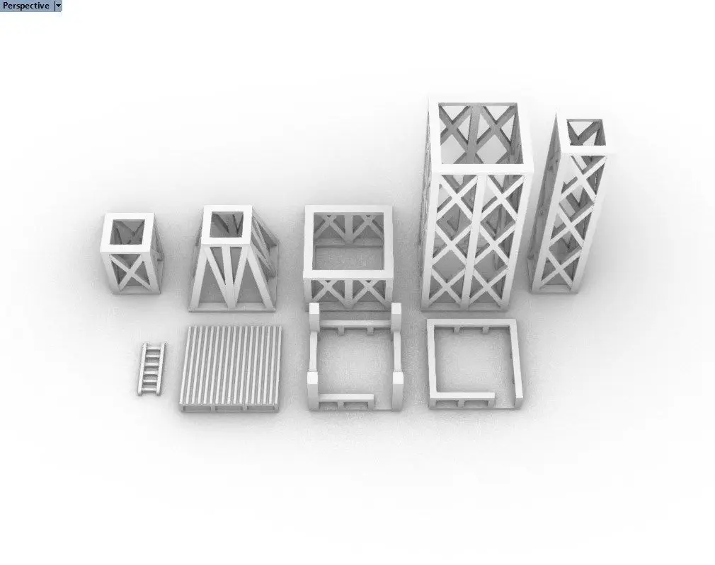 Modular support structure pack for tabletop miniature sceneries, dioramas and low poly gaming, design, animation. Includes 9 types of units, tall and short, wide and narrow spaceframe structures, wide to narrow adaptors, vertical ladders and watch platforms with and without roof. Ideal for industrial modern, interwar and scifi settings over plastic, paper and cardboard sceneries.