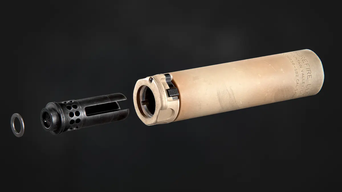 Game-ready Surefire SOCOM556 RC2 and WARCOMP Flash Hider model with 2 different color schemes (Black, Sand). Accurately modeled and textured up to every marking. Feel free to check out all of the other Surefire muzzle devices I have up for sale, they are compatible with this SOCOM can, so you can replace the flash hider.
