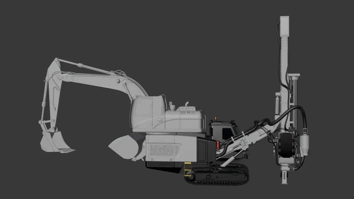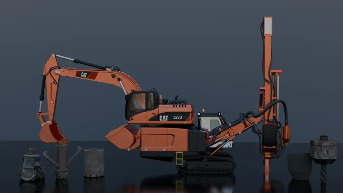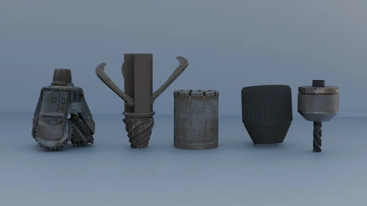 3D model of a Surface Top Hammer Drill with 5 interchangeable drill bits. Created in Blender, this model is optimized for realistic rendering and technical visualization.