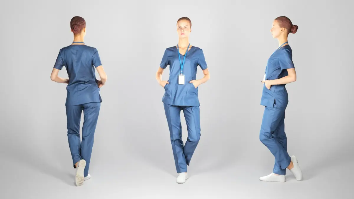 This is a true human size and detailed model of a beautiful young woman of Caucasian appearance dressed in a uniform of a surgical nurse. The model is captured in casual pose to be perfectly matching to variety of architectural visualization, background character, product visualization, e.g. advert banners, professional products/devices presentations, etc.