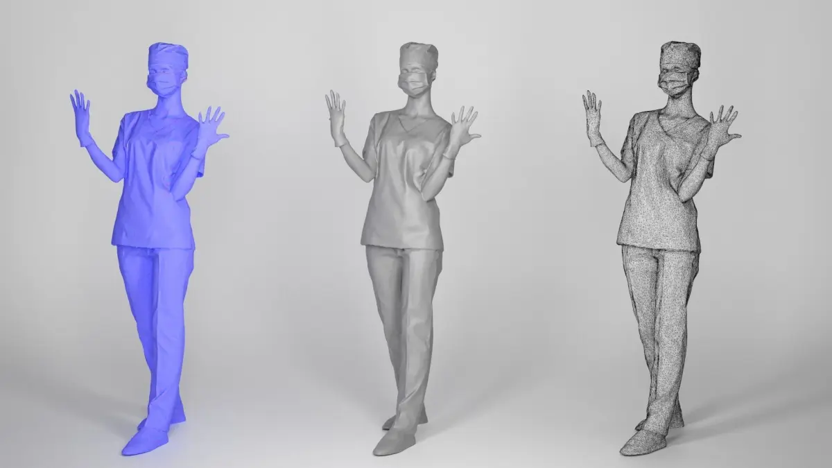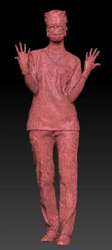 This is a true human size and detailed model of a beautiful young woman of Caucasian appearance dressed in a uniform of a surgical nurse. The model is captured in casual pose to be perfectly matching to variety of architectural visualization, background character, product visualization, e.g. advert banners, professional products/devices presentations, etc.