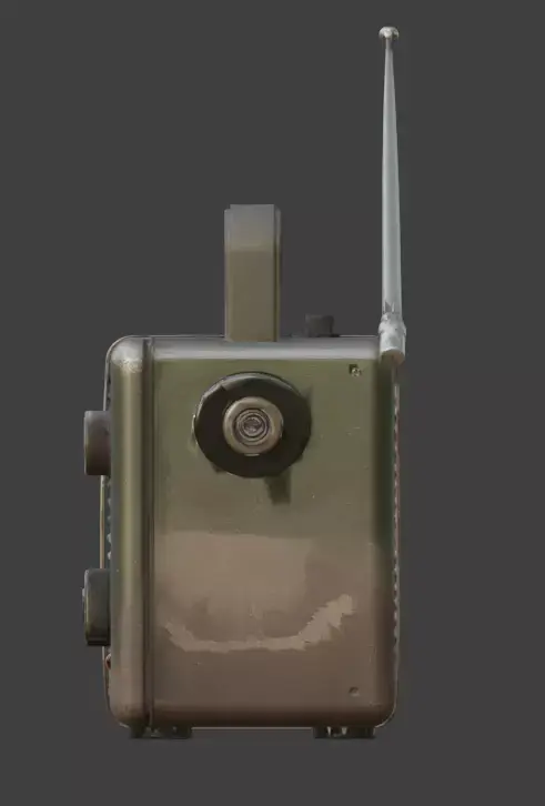 Tags3d model survival radio military green weathered metal game ready prop post-apocalyptic gear taped battery wire antenna field radio industrial wear analog dial realistic rust isolated asset pbr materials communication prop survival gear digital sculpture