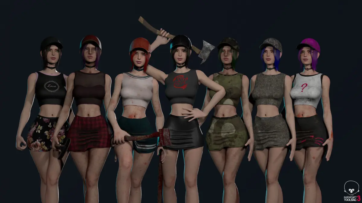 There are 7 skins for painting clothes, as well as 7 types of weapons for your girl's survival).