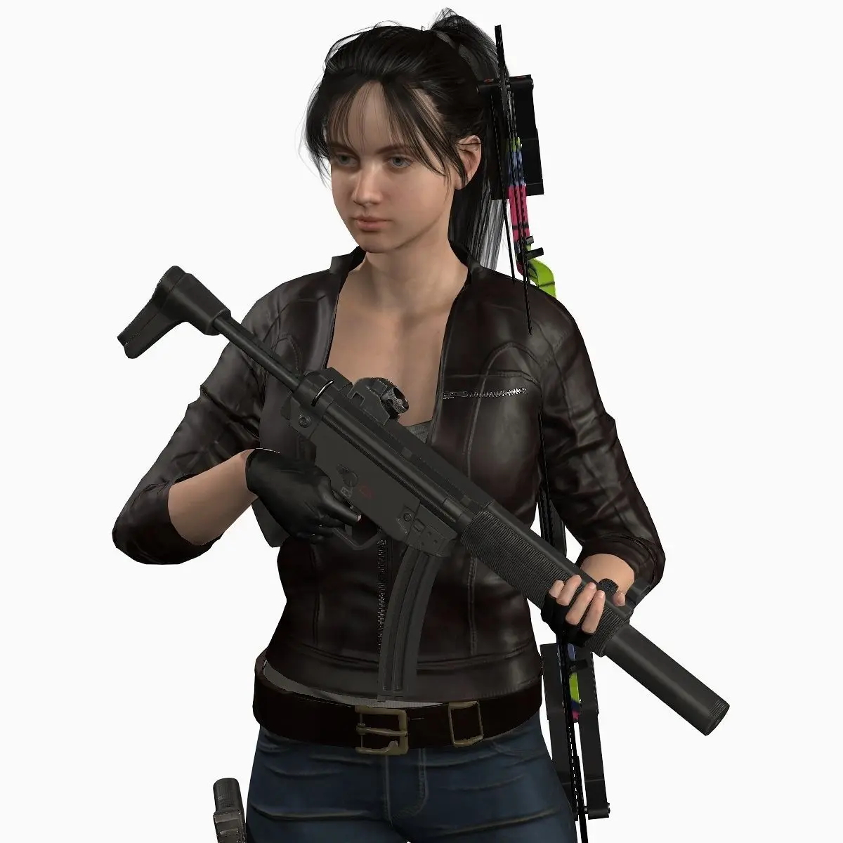 Survivor girl 3d character in highpoly resolution character was exported 3ds max , maya,blender In addition rigged FBX files forSurvival character with PBR textures. Character was rendered in substance painter with PBR textures. Character read character&equipment Poly 95,000 / Weapon = Poly (pistol 15,200 / bow 37,578/machine gun 39582)