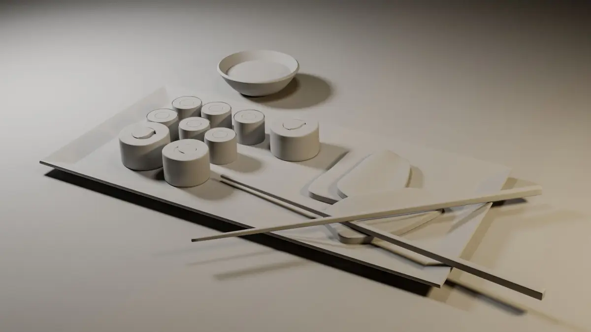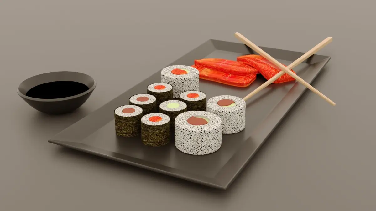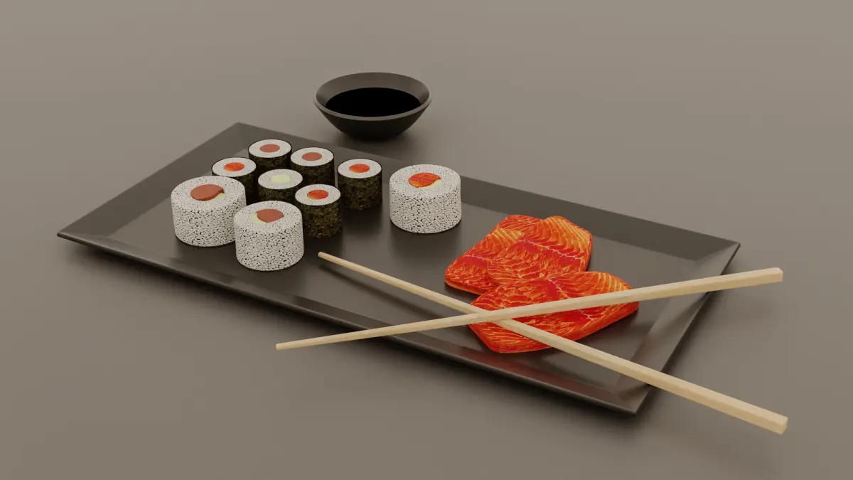 Sushi and sashimi, modeled in Cienema 4D, render with Corona.