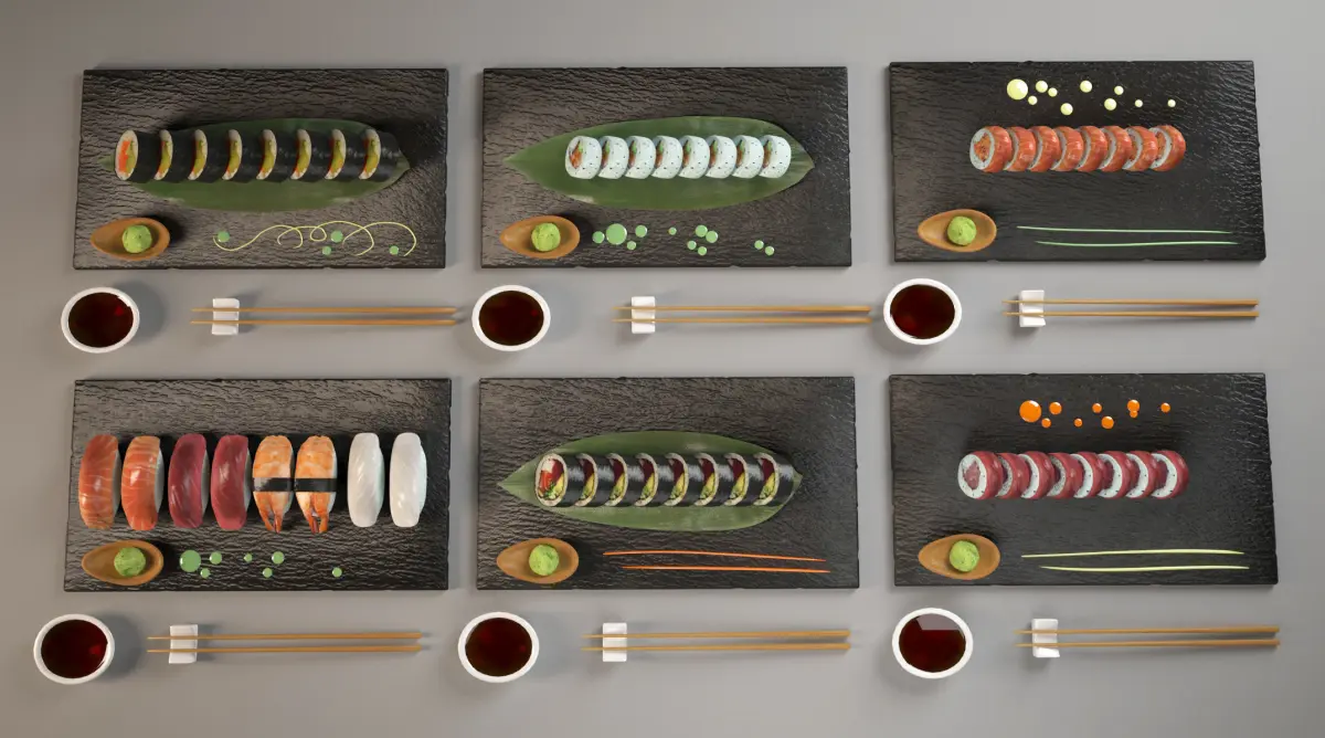 Conveyor belt sushi Kaitenzushi : 13 differents pieces .Sushi Dishes on Ardesia plates : 6 different pieces.Low poly models. All piece together count : 80.000Good for videogame or any other use.