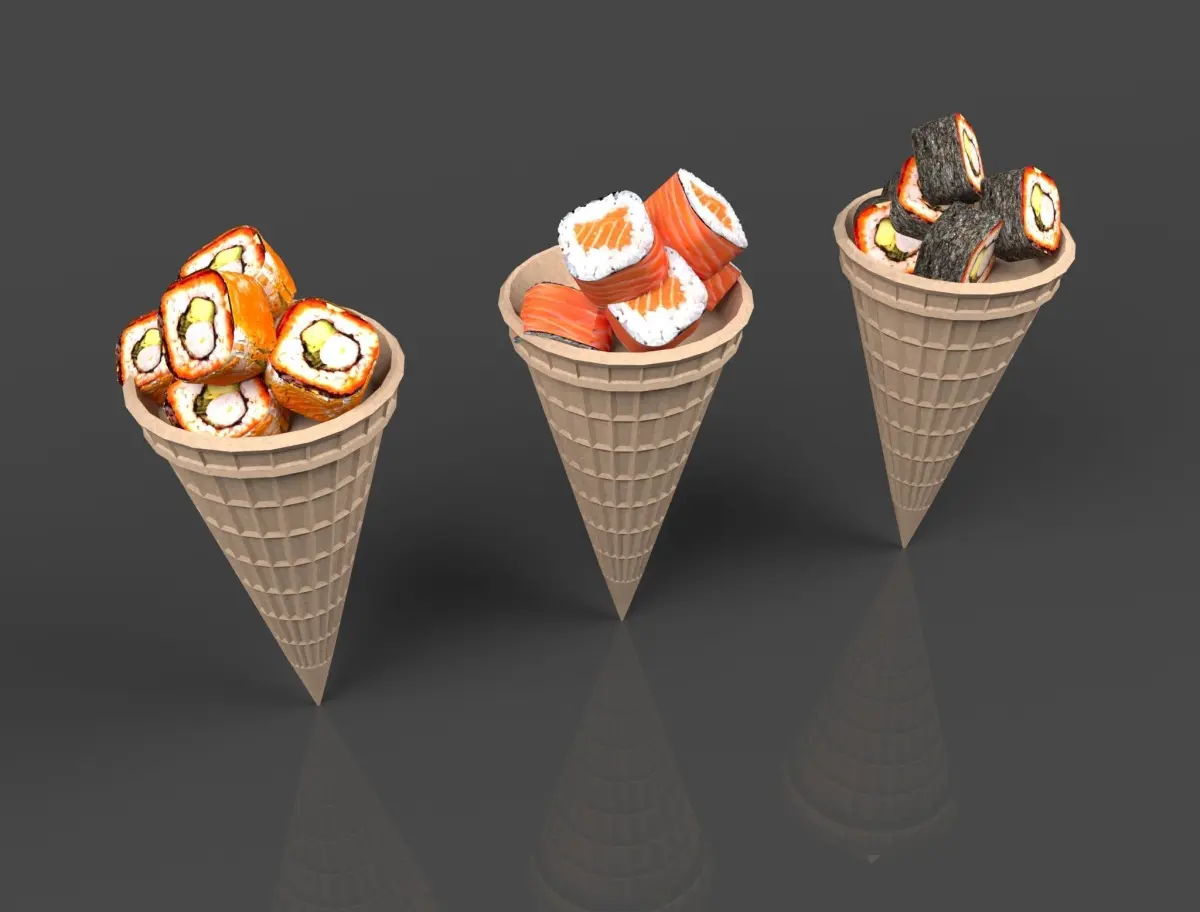 Sushi in waffle cups is a high quality model. Models possible to use in any project. Originally modelled in 3ds max 2015. Final images rendered with Corona 1.7 . Model resolutions are optimized for polygon efficiency. All colors can be easily modified. Model is fully textured with all materials applied. No cleaning up necessary, just drop your models into the scene and start rendering. No special plugin needed to open scene.