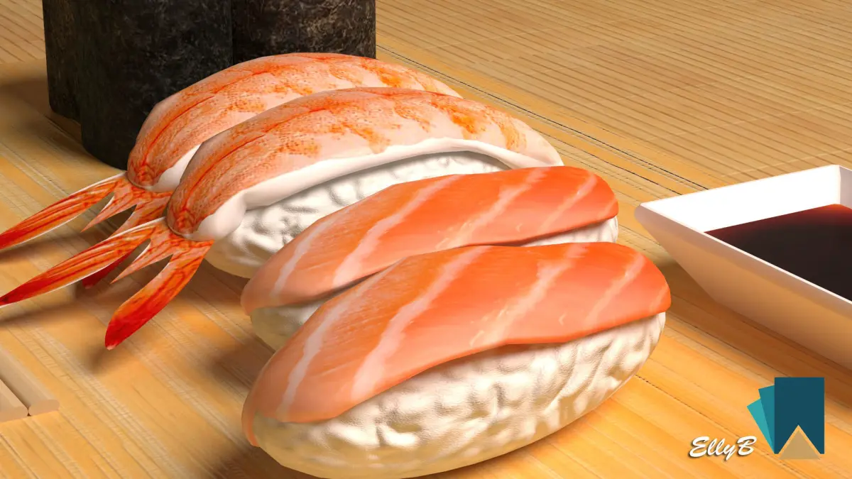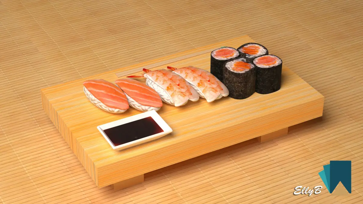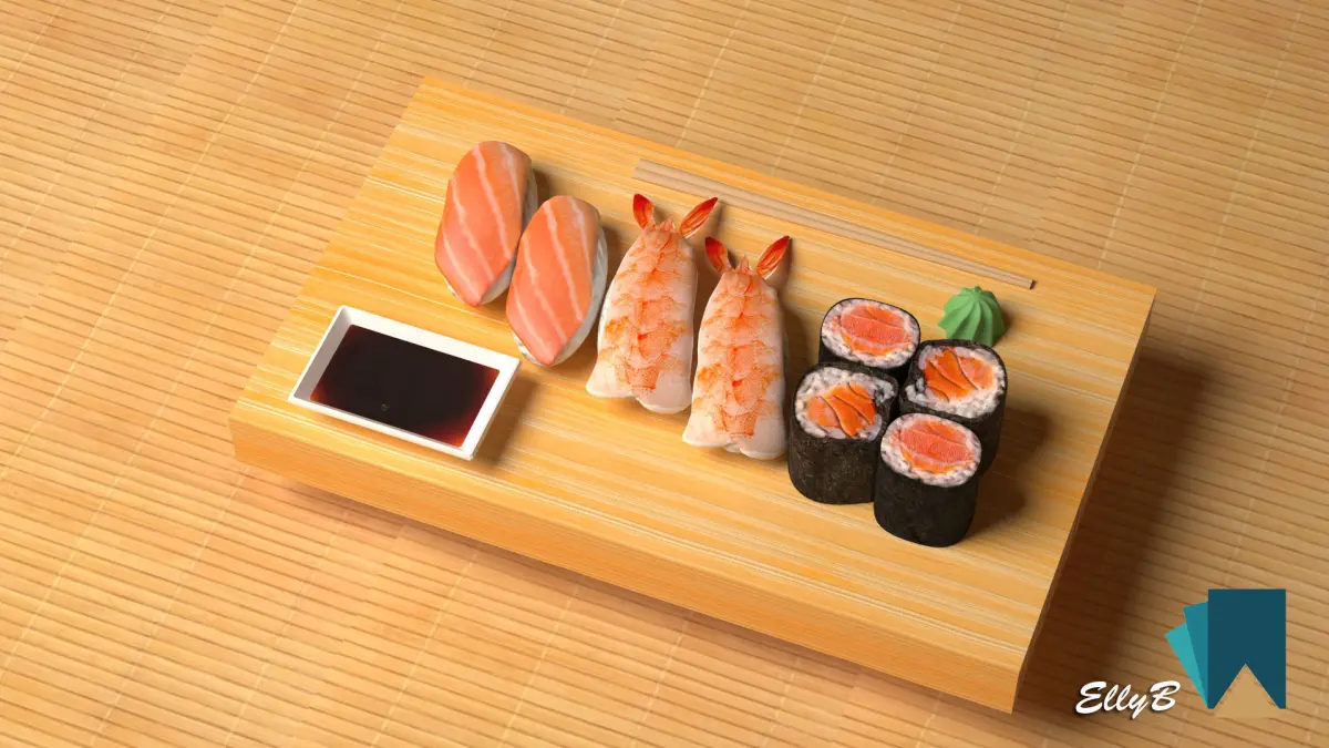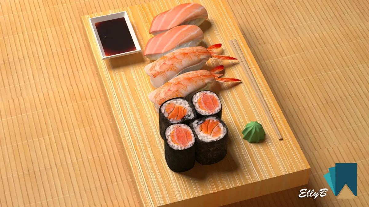 Sushi with chopsticks on wooden table 3D model