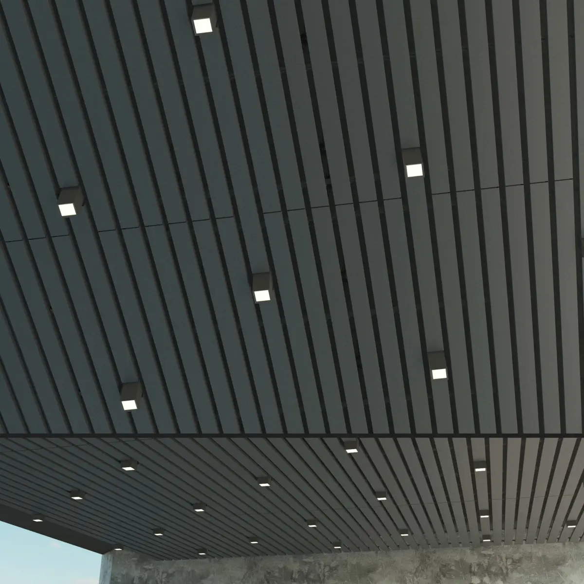 - rack and pinion metal ceiling with fasteners (combs, suspensions) . The size of the fragment ceiling 10h10m. Docks on all sides. It is possible to close the space of any size. Width of a lath of 50 mm., an interval of 50 mm.