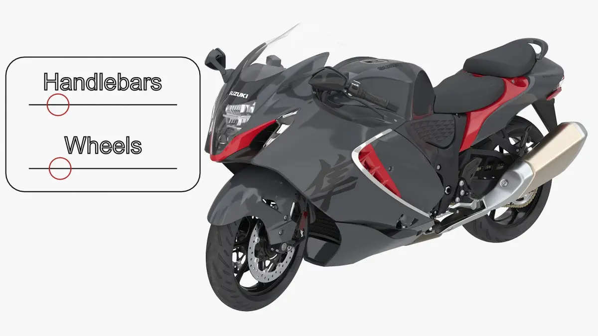 Suzuki Hayabusa GSX-1300R Inline-Four Sportbike Black Red Rigged is fully rigged and is ready to be animated. You can easily position it the way you need or animate it the way your project requires using helpers in 3D Studio Max. See the turntable to get an idea of how rigging works.
